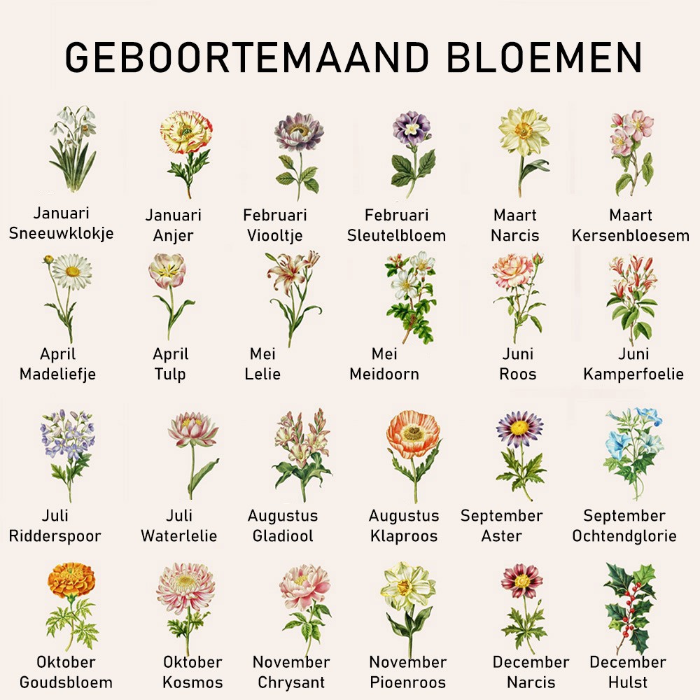 -- Selecteer 12e bloemtype -- Januari-Anjer Januari-Sneeuwklokje Februari-Sleutelbloem Februari-Viooltje Maart-Kersenbloesem Maart-Narcis April-Madeliefje April-Tulp Mei-Meidoorn Mei-Lelie Juni-Kamperfoelie Juni-Roos Juli-Ridderspoor Juli-Waterlelie Augustus-Gladiool Augustus-Klaproos September-Aster September-Ochtendglorie Oktober-Kosmos Oktober-Goudsbloem November-Chrysant November-Pioenroos December-Hulst December-Narcis