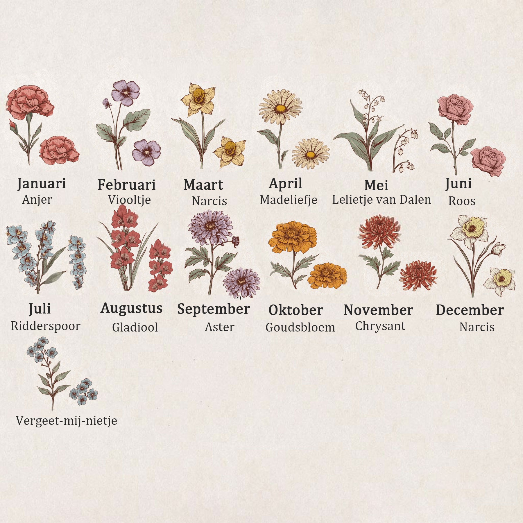 -- Selecteer 16e bloemtype -- Januari-Anjer Februari-Viooltje Maart-Narcis April-Madeliefje Mei-Lelietje van Dalen Juni-Roos Juli-Ridderspoor Augustus-Gladiool September-Aster Oktober-Goudsbloem November-Chrysant December-Narcis Miskraam & Verlies - Vergeet me niet