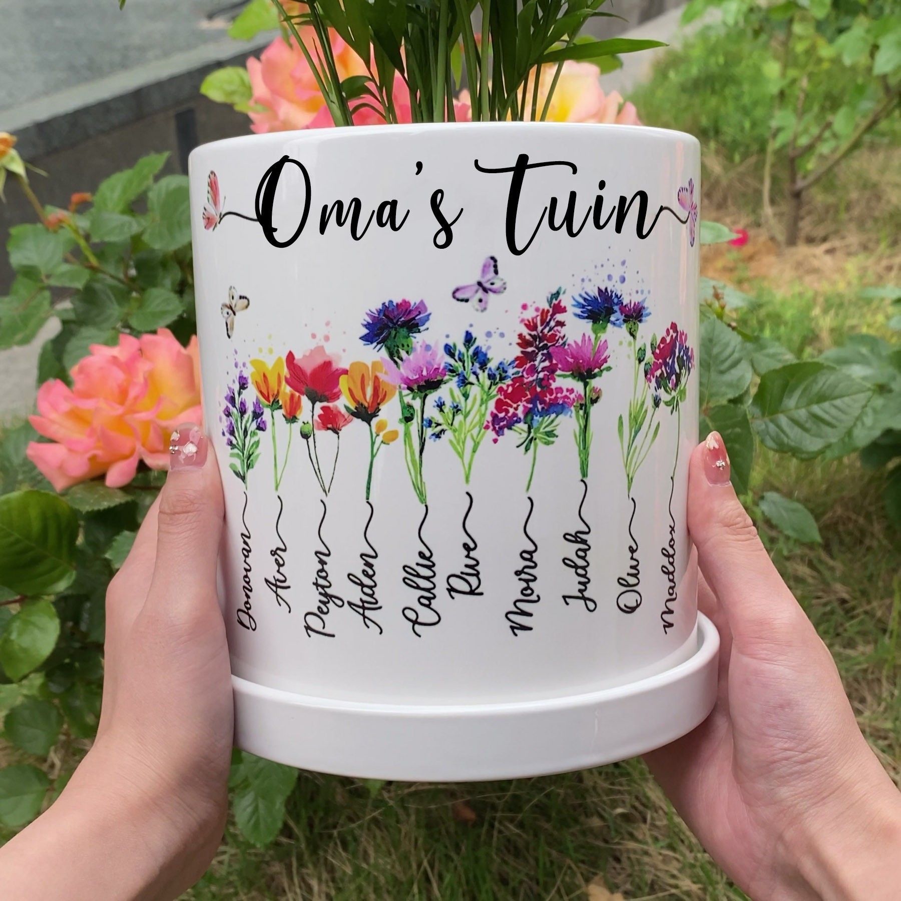 Gepersonaliseerde kunstprint: oma's tuin, geboortebloempot met namen van kleinkinderen. Unieke cadeaus voor mama, oma, Moederdag cadeau-ideeën.