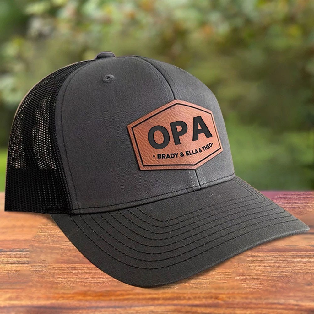 Gepersonaliseerde leren honkbalpet met de naam van het kind, een uniek cadeau voor papa en ook een geweldig cadeau voor Vaderdag voor nieuwe vaders.