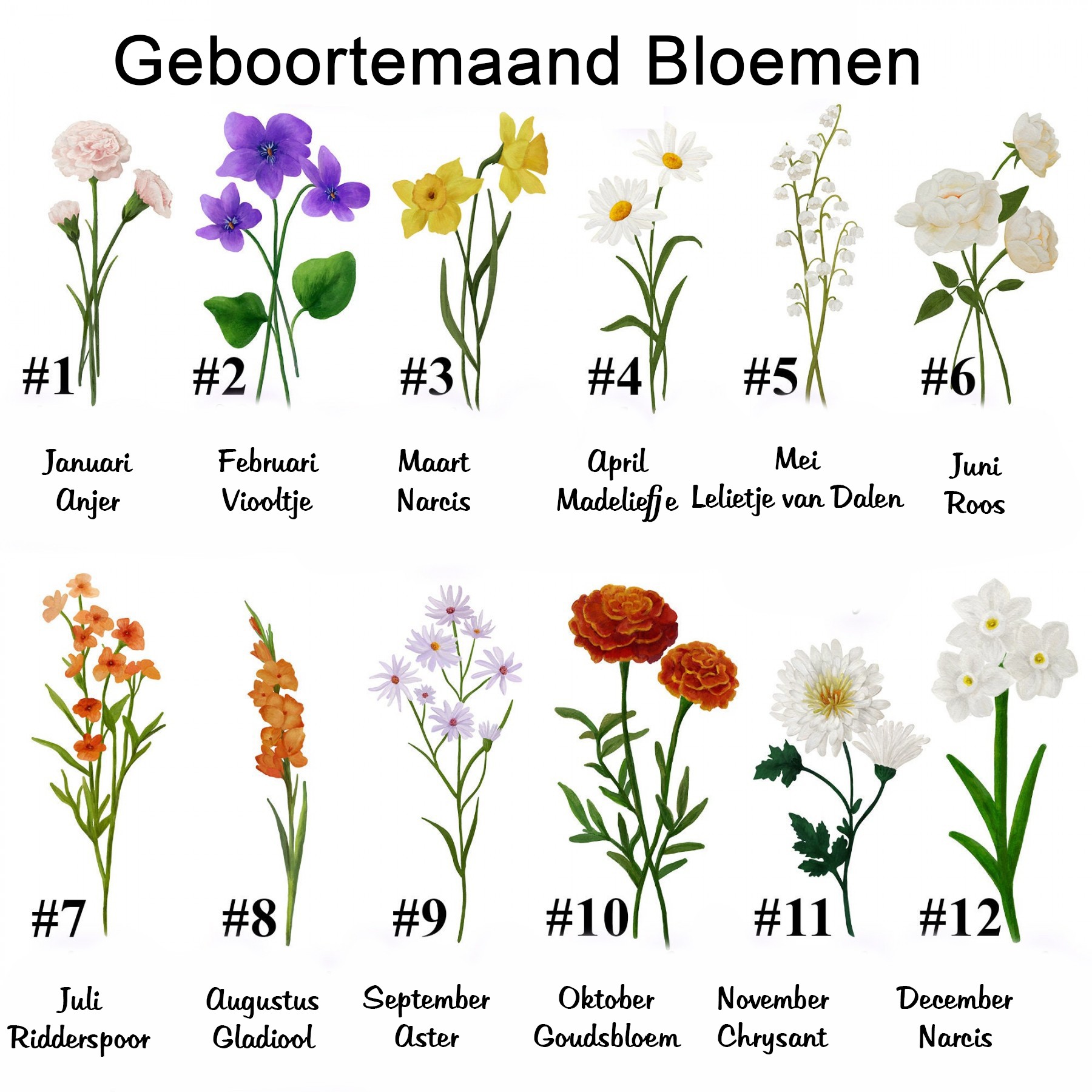 -- Selecteer 13e bloemtype -- Januari-Anjer Februari-Viooltje Maart-Narcis April-Madeliefjes Mei-Lelietje van Dalen Juni-Roos Juli-Ridderspoor Augustus-Gladiool September-Aster Oktober-Goudsbloem November-Chrysant December-Narcis