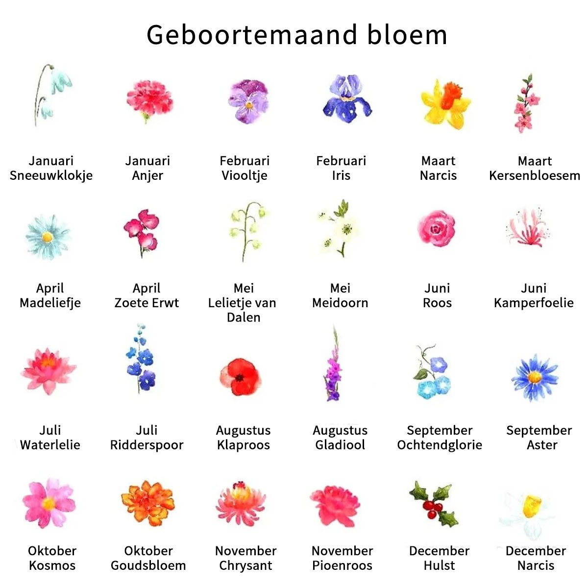 -- Selecteer 5e bloemtype -- Januari-Anjer Januari-Sneeuwklokje Februari-Iris Februari-Viooltje Maart-Kersenbloesem Maart-Narcis April-Zoete Erwt April-Madeliefje Mei-Lelietje van Dalen Mei-Meidoorn Juni-Kamperfoelie Juni-Roos Juli-Ridderspoor Juli-Waterlelie Augustus-Klaproos Augustus-Gladiool September-Aster September-Ochtendglorie Oktober-Goudsbloem Oktober-Kosmos November-Chrysant November-Pioenroos December-Hulst December-Narcis