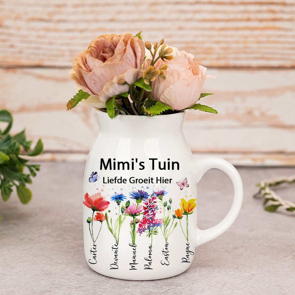 Gepersonaliseerde Nana's Tuin geboortebloemvaas met namen van kleinkinderen. Familiegeschenk als aandenken. Verjaardagscadeau voor moeder en oma. Unieke cadeau-ideeën voor Moederdag.