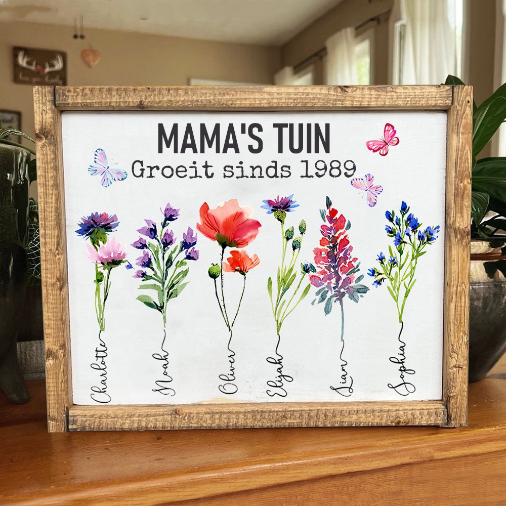 Gepersonaliseerde Oma's Tuin Geboortebloem Kunstprint Naamplaatje Met Houten Lijst Uniek Verjaardagscadeau voor Mama Oma Moederdag Cadeaus