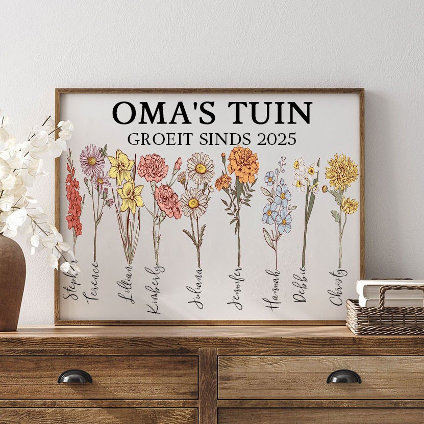 Gepersonaliseerde oma's tuin geboortemaand bloemenprintlijst met namen van kleinkinderen Verjaardagscadeaus voor oma en moeder Babyshowercadeau Moederdag cadeau-ideeën