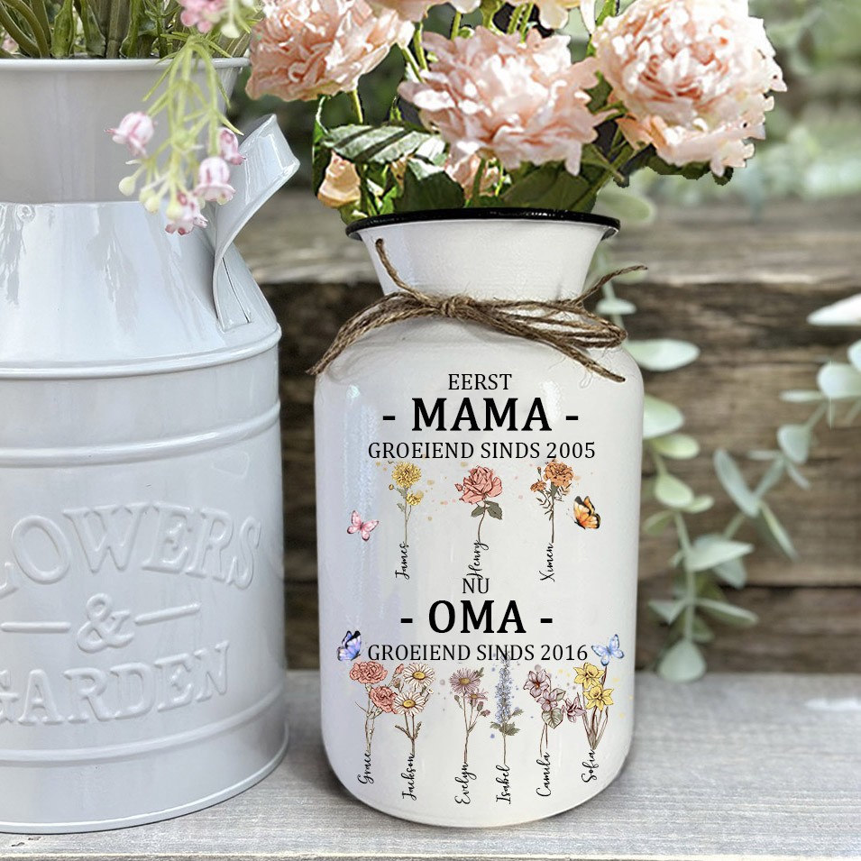 Gepersonaliseerde Vaas 'Eerst Mama, nu Oma' | Met Geboortebloemen & Namen van Kleinkinderen | Uniek Moederdagcadeau