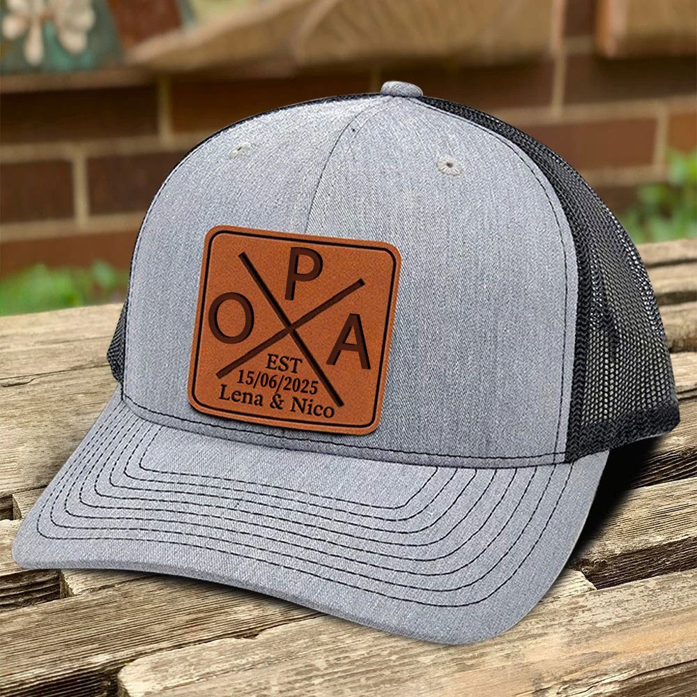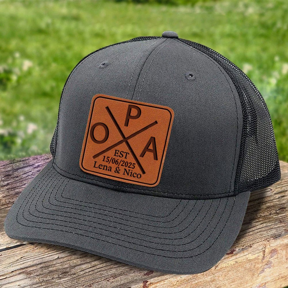 Gepersonaliseerde zomerzonnehoed van echt leer met datum en naam van het kind, cadeau-idee voor een nieuwe vader, betekenisvol cadeau voor vaders, cadeau voor Vaderdag