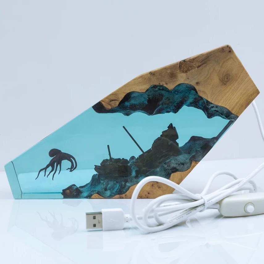 Octopus Schipbreuk Nachtlampje Hars Houten Lamp Blauwe Oceaan Miniatuur Speciaal Verjaardagscadeau Uniek Koppel Cadeau Voor Soulmate Nachtkastje Cadeau Idee Voor Valentijnsdag