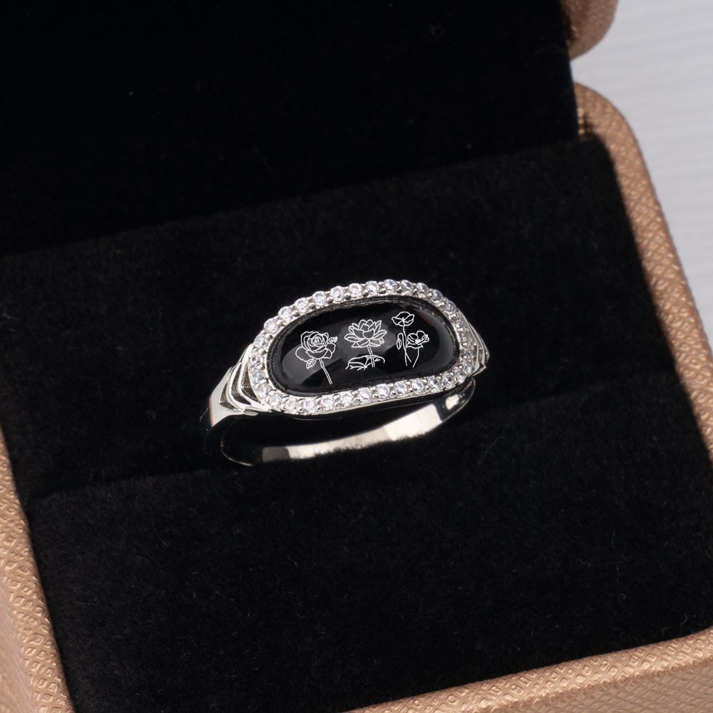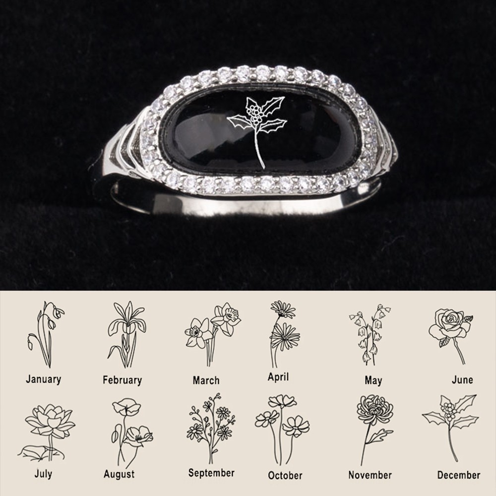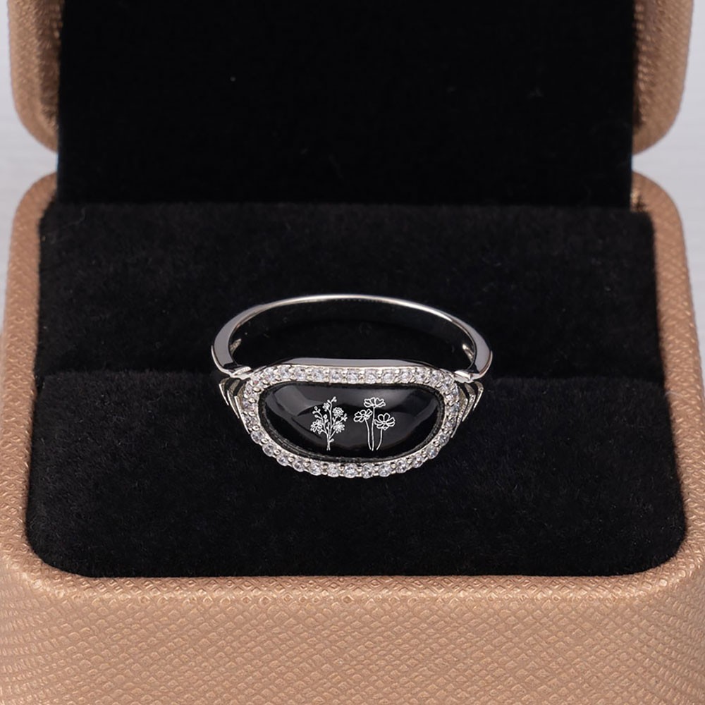 Gepersonaliseerde zwarte schelp geboortebloemenring