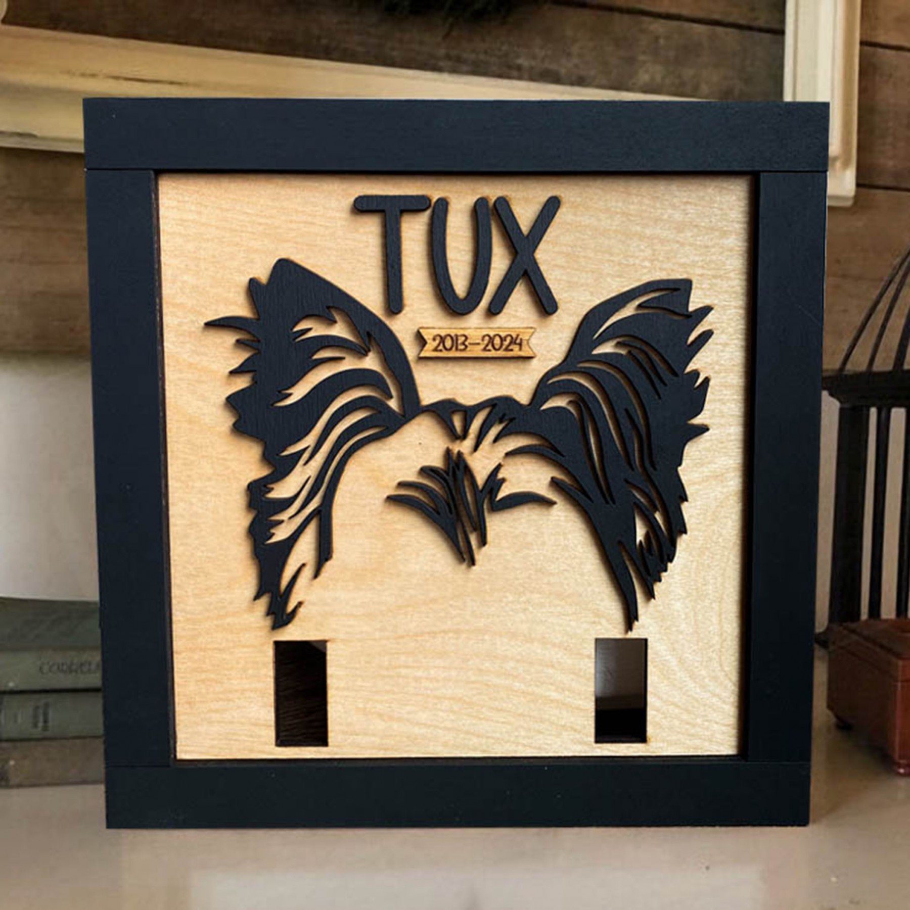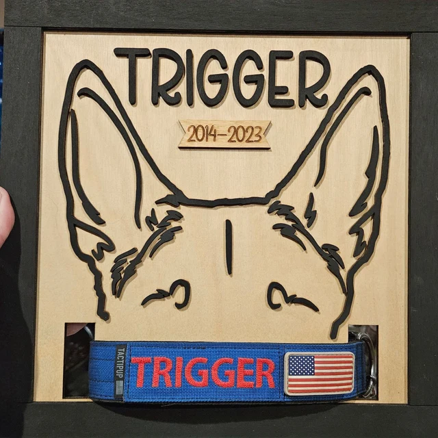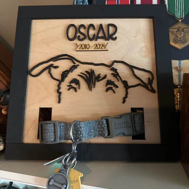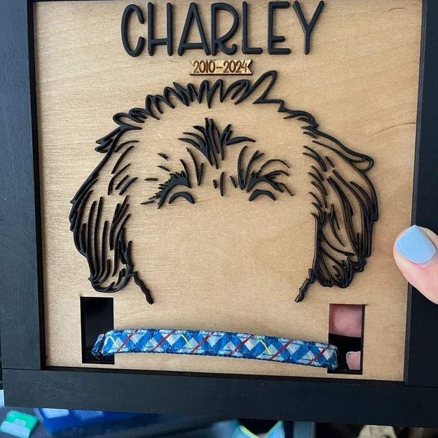 Gepersonaliseerd houten frame met hondenoorcontour en halsbandhouder als gedenkwaardig cadeau voor dierenliefhebbers