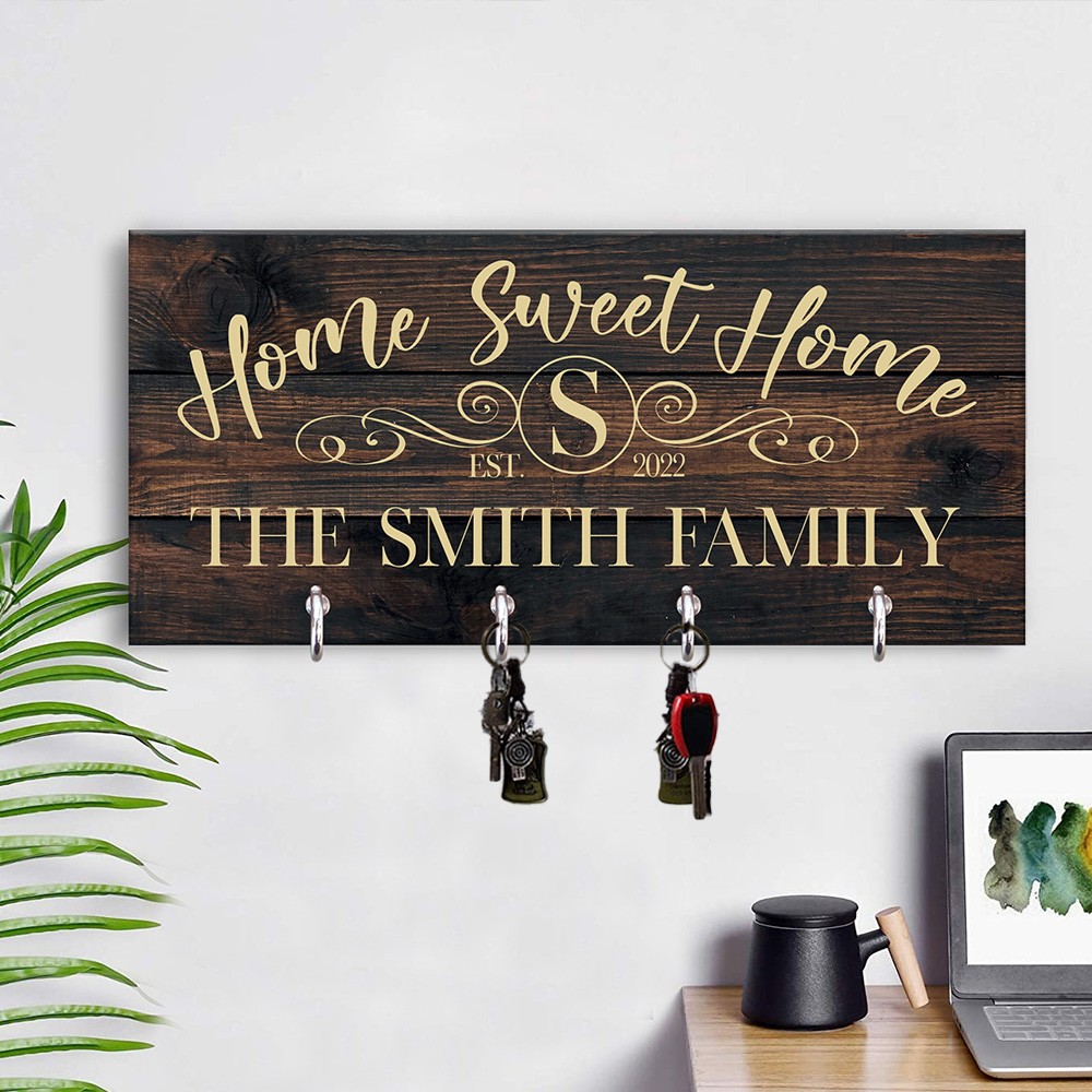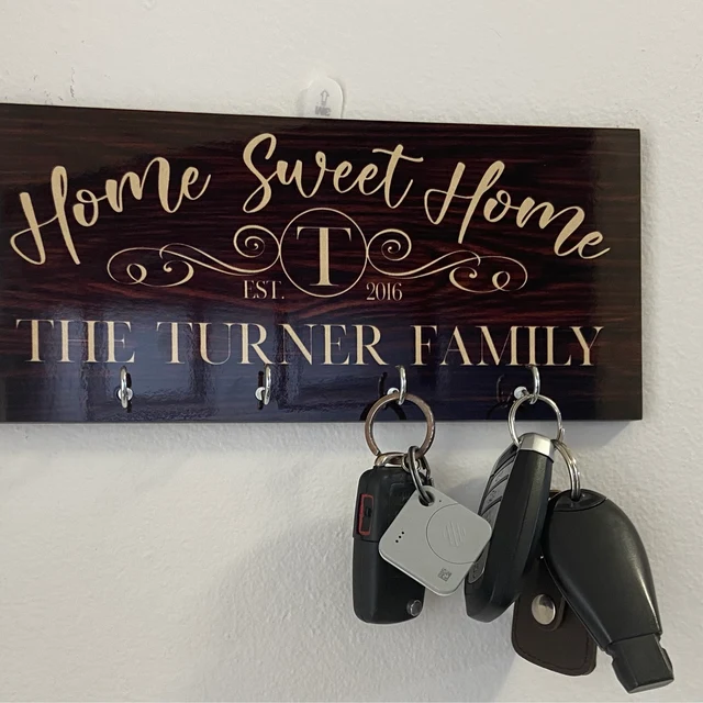 Gepersonaliseerde gegraveerde houten sleutelhanger met familienaam voor aan de muur Housewarming cadeau voor koppel Huwelijkscadeau