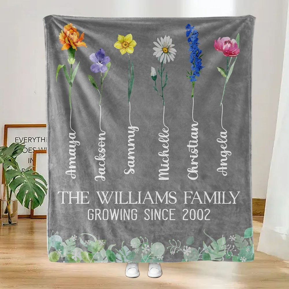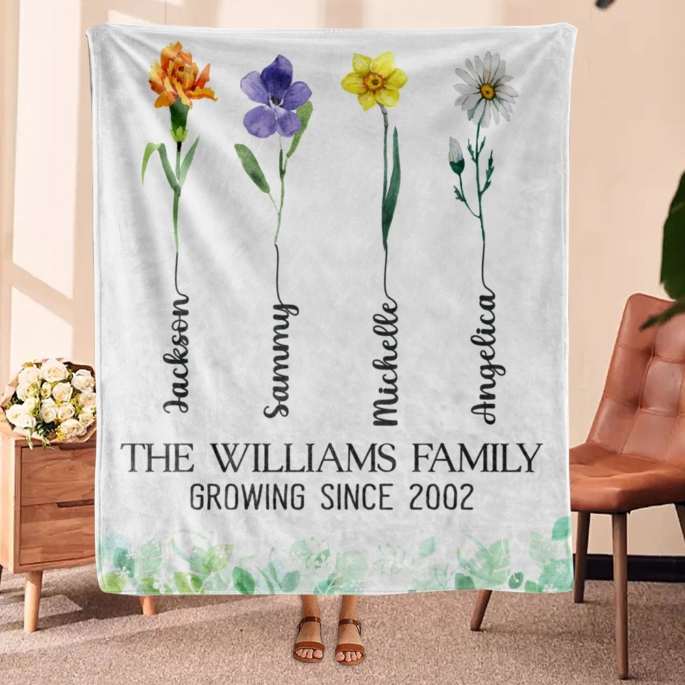 Gepersonaliseerde familiegeboortebloemdeken met kindernamen