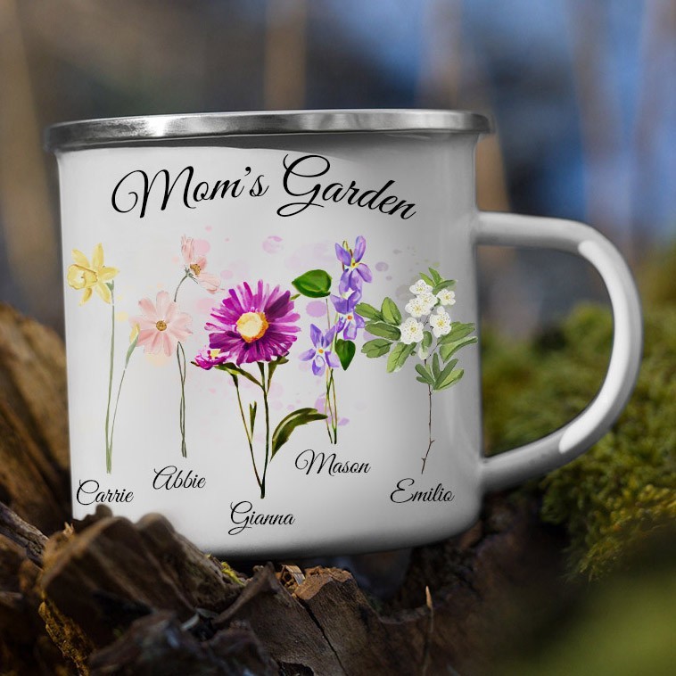 Gepersonaliseerde oma's geboortebloem kampeermok met kindernamen