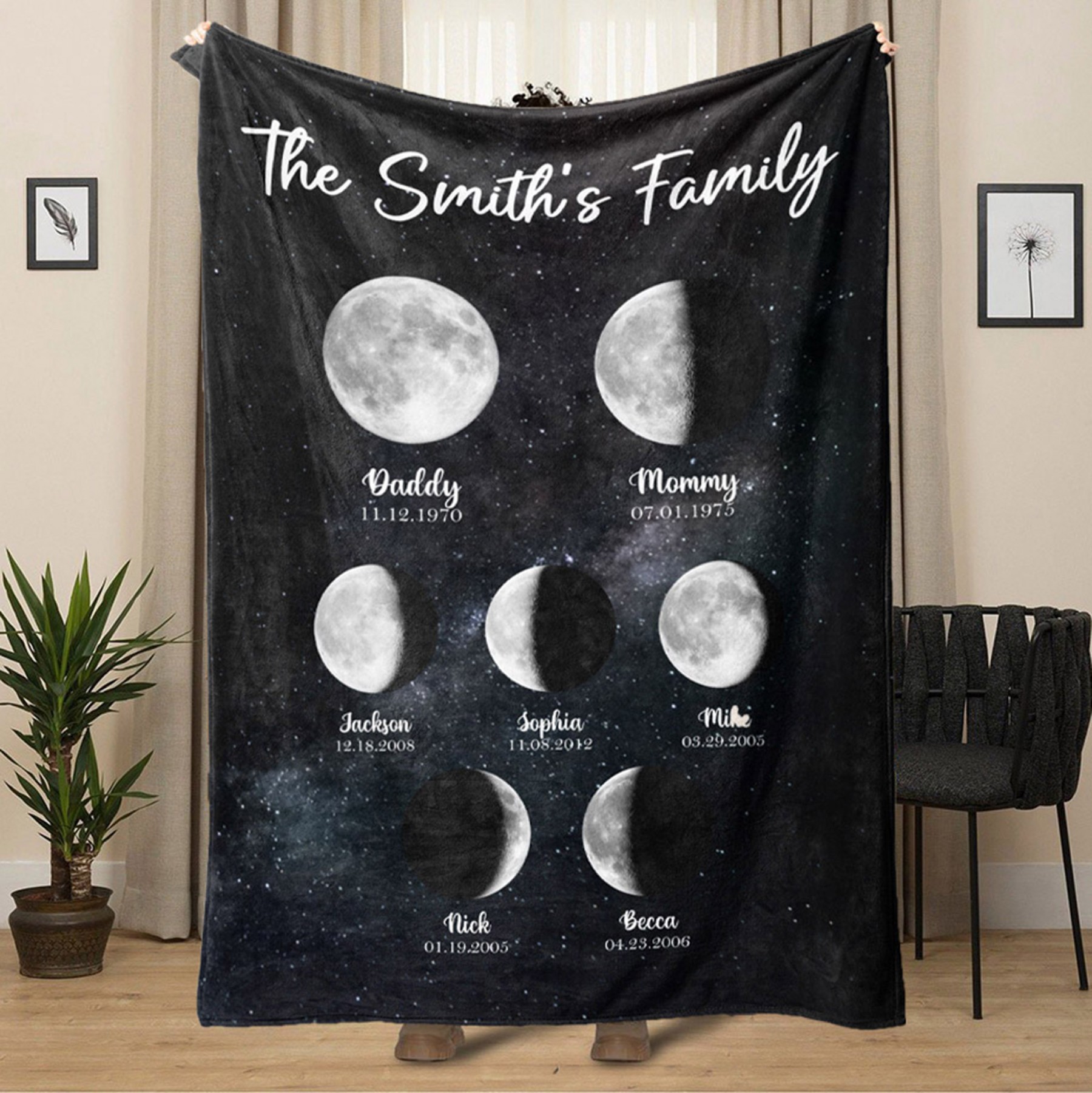 Gepersonaliseerde maanfase-familiedeken met kindernamen Familie-aandenkengeschenken