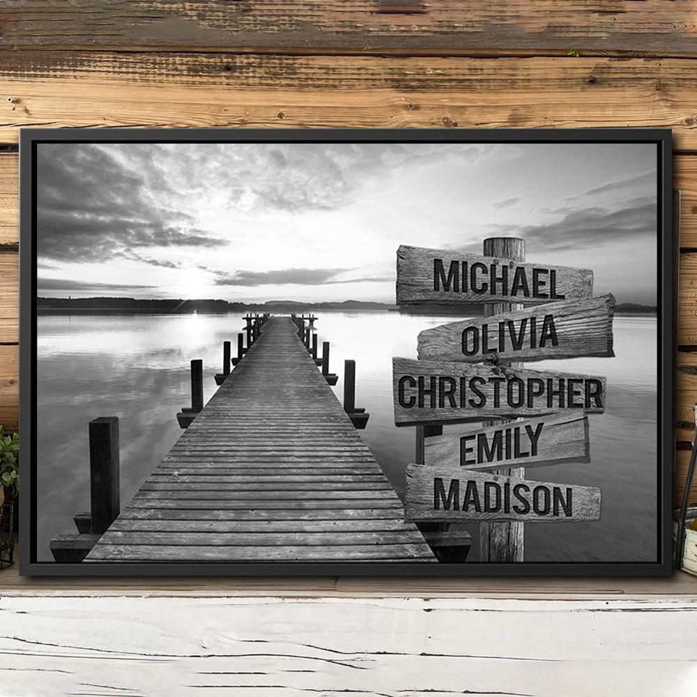 Gepersonaliseerd Sunset Lake Dock Family Street Frame-bord met meerdere namen Familie cadeau-ideeën