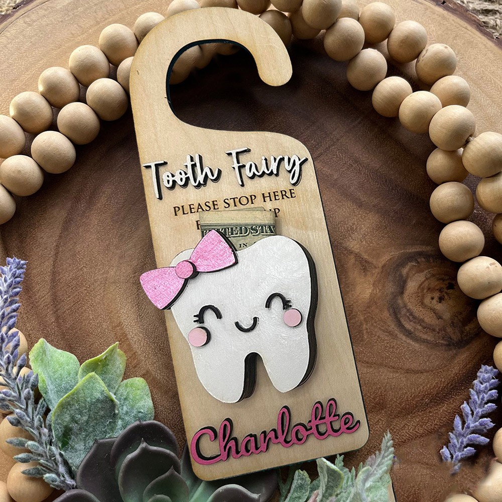 Gepersonaliseerde deurhanger in de vorm van een tandenfee met een geldhouder als aandenken voor kinderen