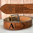 Gepersonaliseerde leren herenriem met gegraveerd patroon van vader en zoons vuistje. Een attent verjaardagscadeau voor papa. Uniek cadeau voor Vaderdag.