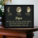 Gepersonaliseerde kunstprint van een houten familiebord met maanfasen en namen voor de kinderen. Unieke familiecadeaus voor vader en opa. Ideeën voor Vaderdagcadeaus.