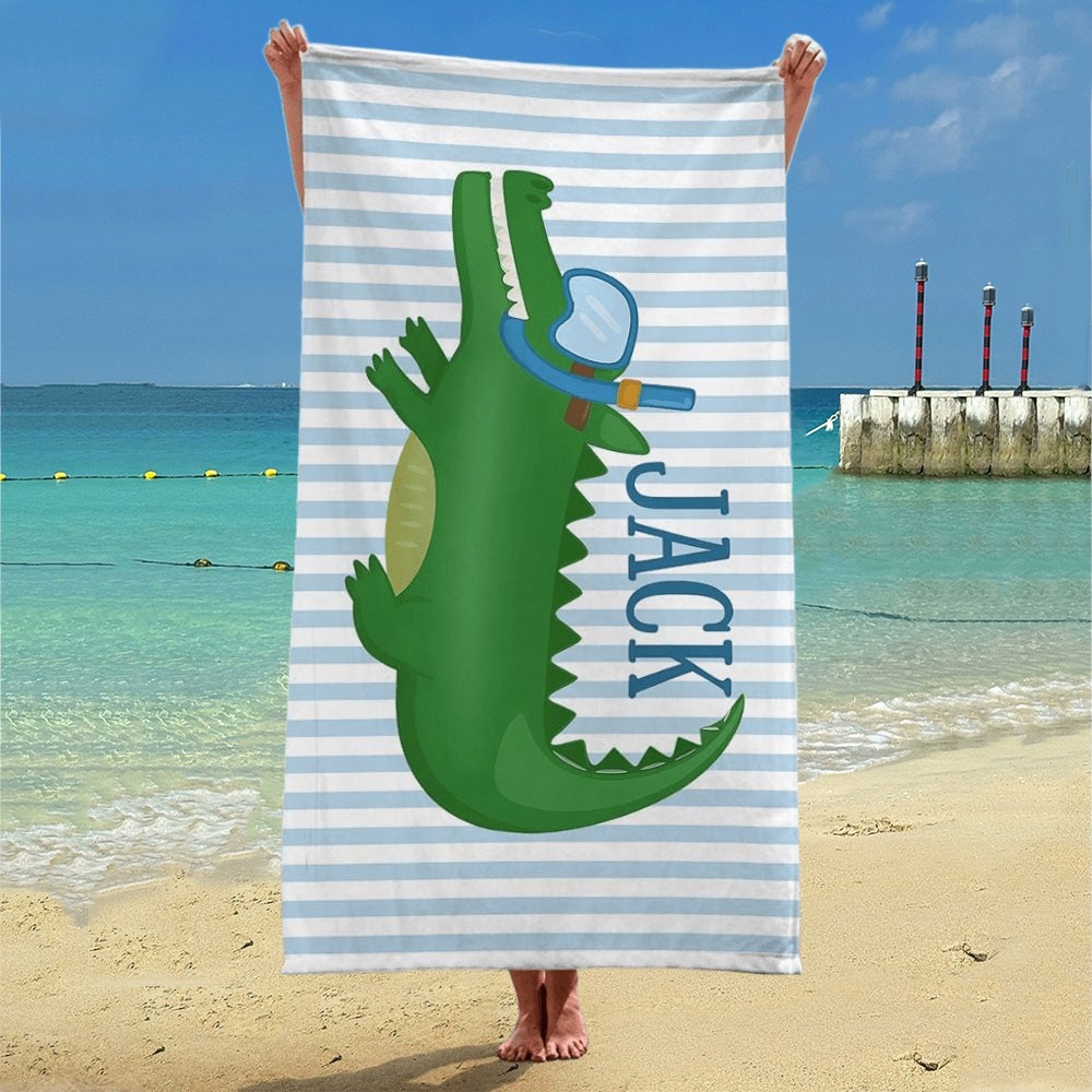 Personalized Cute Diving Alligator Striped Beach Towel with Name for Kids Summer Gift for Boys Girls