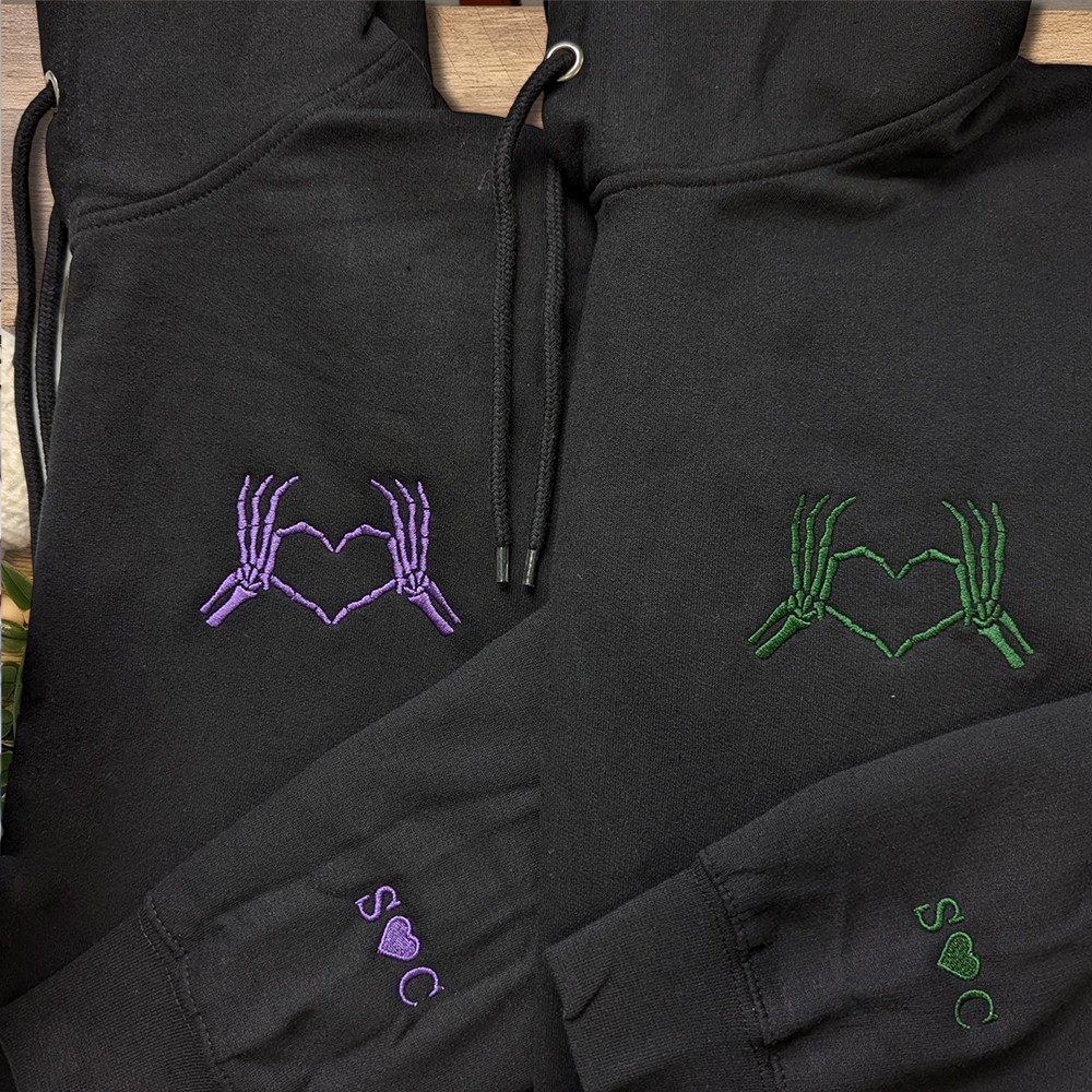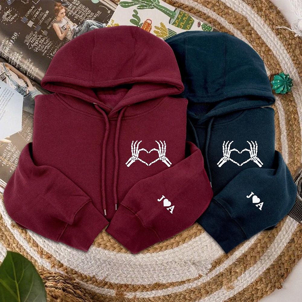 Personalized Embroidered Skeleton Heart Hoodie with Initial on Sleeve Unique Gifts for Couple Valentine's Day Gift