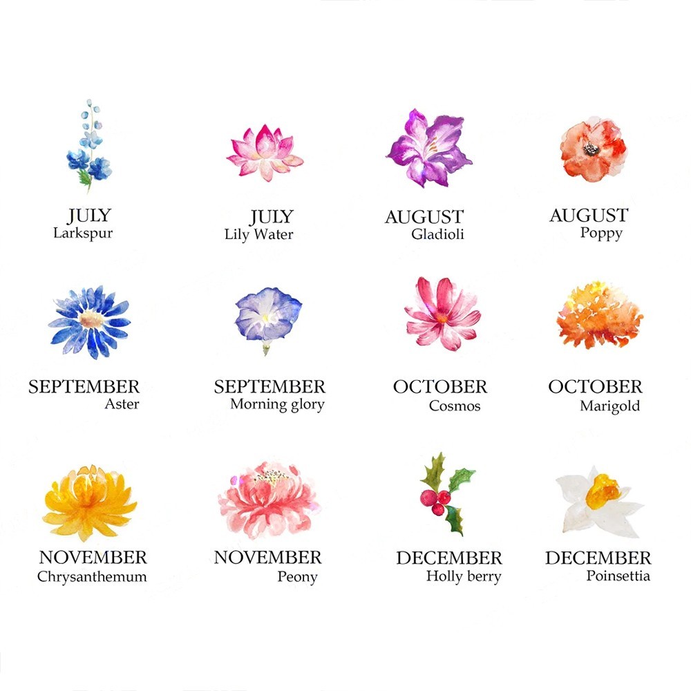 -- Select 6th Flower Type -- January-Carnation January-Snowdrop February-Iris February-Violet March-Daffodil March-Cherry Blossom April-Sweet Pea April-Daisy May-Hawthorn May-Lily of the Valley June-Honeysuckle June-Rose July-Lily Water July-Larkspur August-Poppy August-Gladiolus September-Morning Glory September-Aster October-Cosmos October-Marigold November-Chrysanthemum November-Peony December-Poinsettia December-Holly Berry