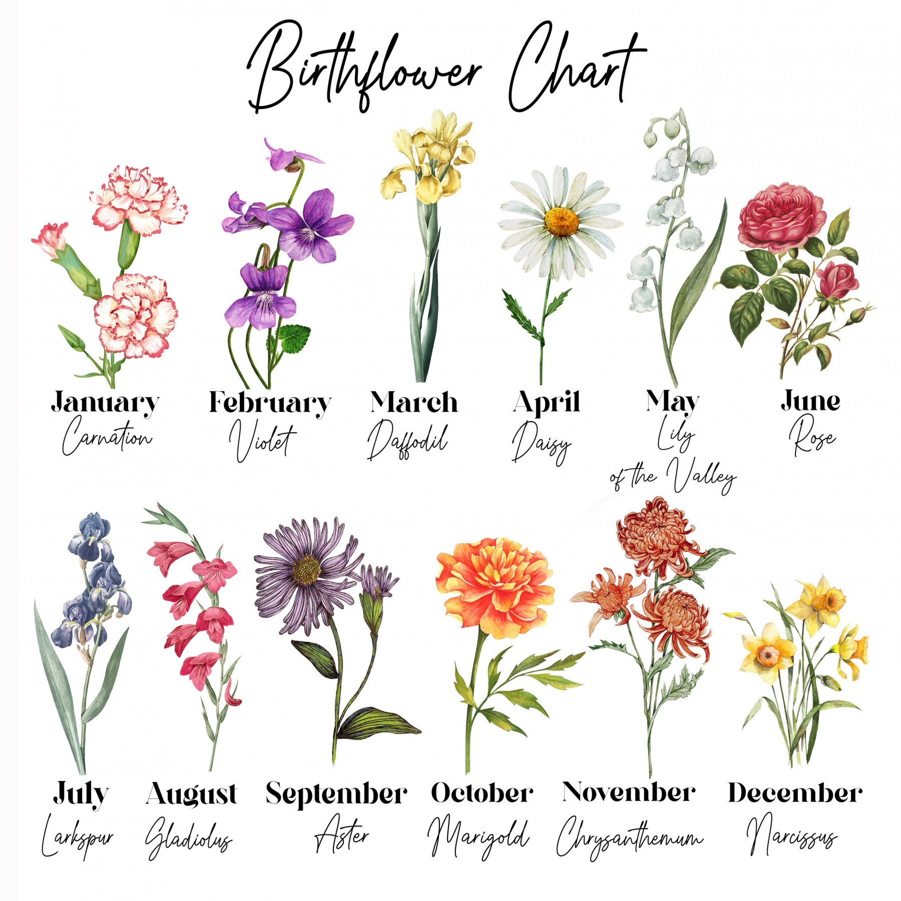 -- Select 12th Flower Type -- January-Carnation February-Violet March-Daffodil April-Daisy May-Lily of the Valley June-Rose July-Larkspur August-Gladiolus September-Aster October-Marigold November-Chrysanthemun December-Narcissus