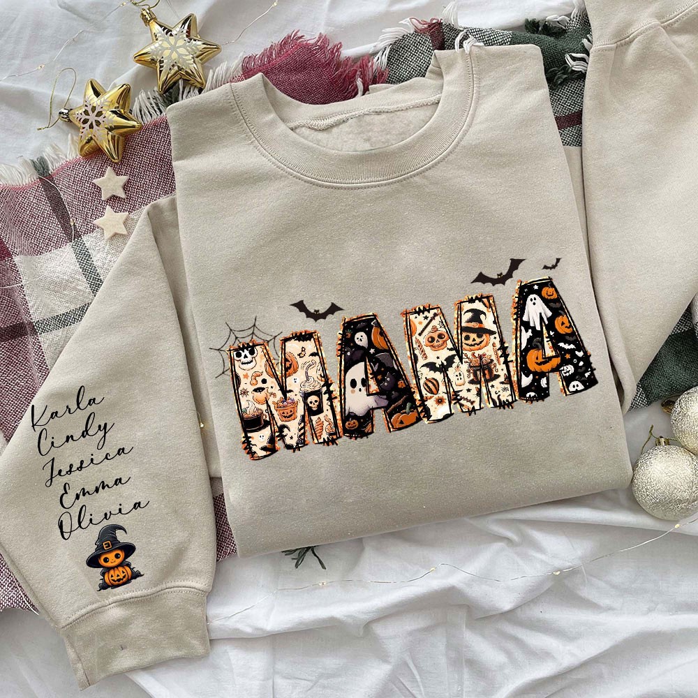 Personalized Halloween Mama Sweatshirt with Kids Names on Sleeve Gifts for Mom Halloween Gift