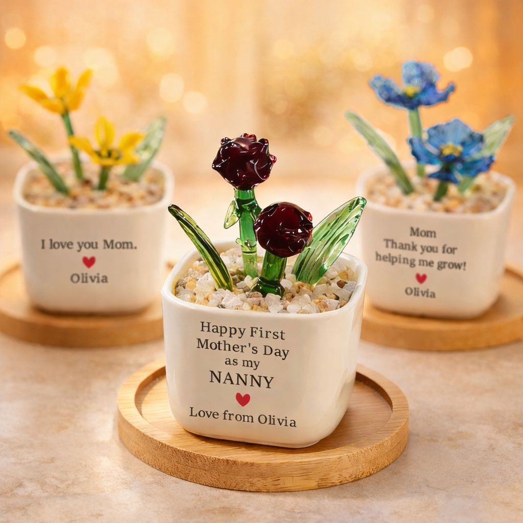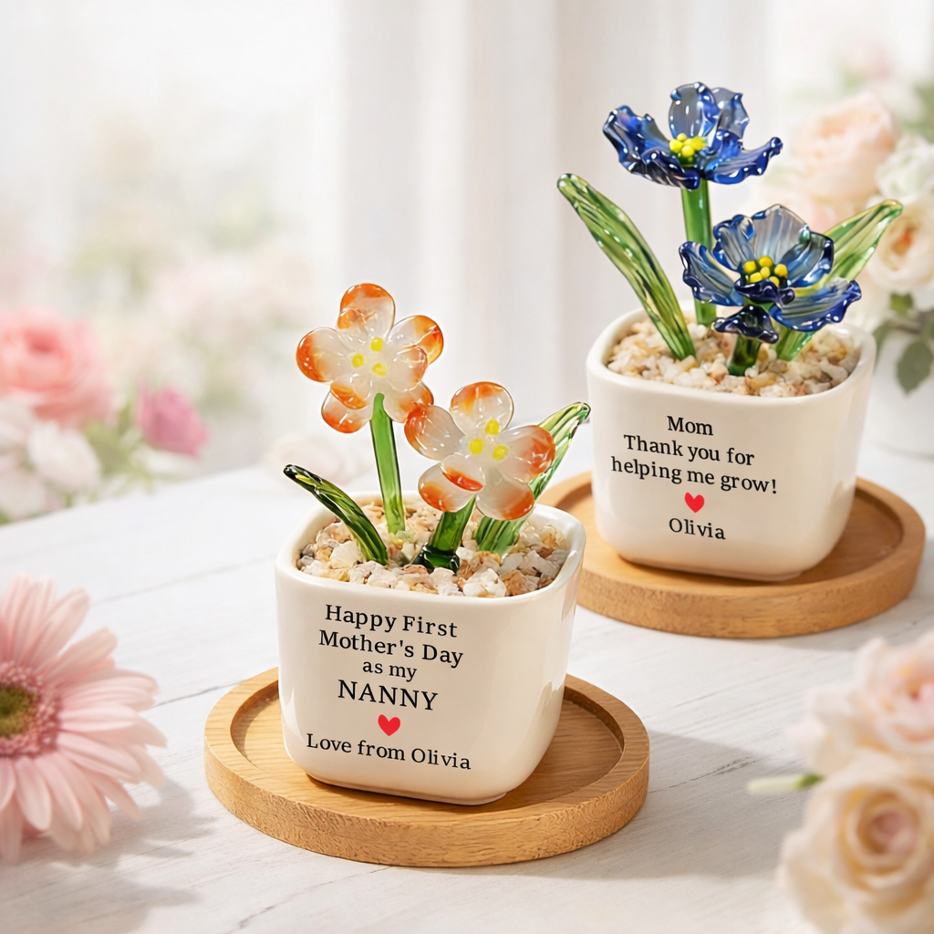 Personalized Hand Blown Glass Potted Plants Birth Flower Pot Family Keepsake Gifts for Mom or Grandma Unique Mothers Day Gift Ideas