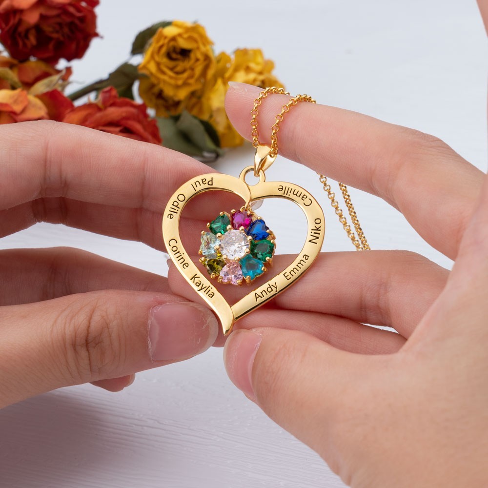Personalized Heart Shaped Family Names Necklace With 1-8 Birthstones Unique Gift For Mom Grandma