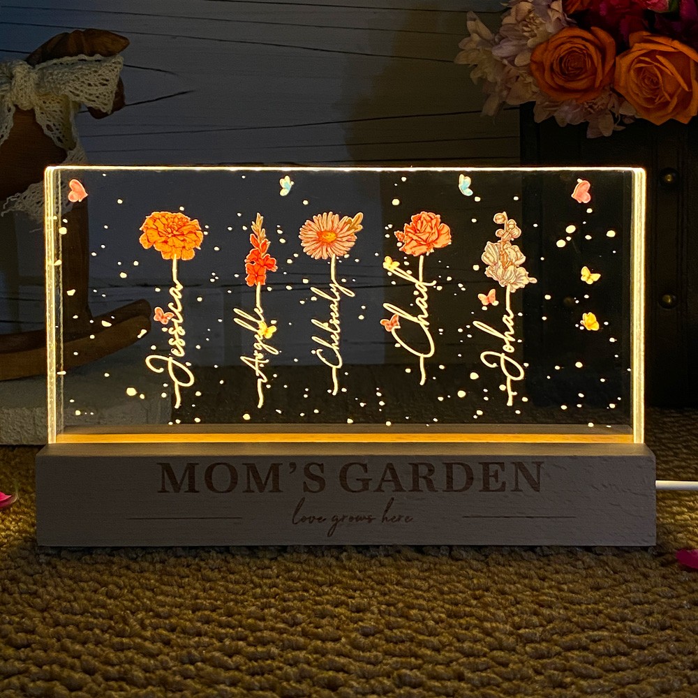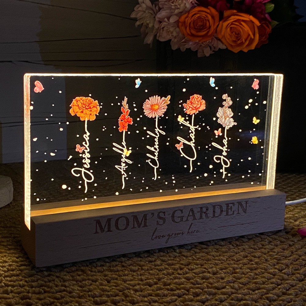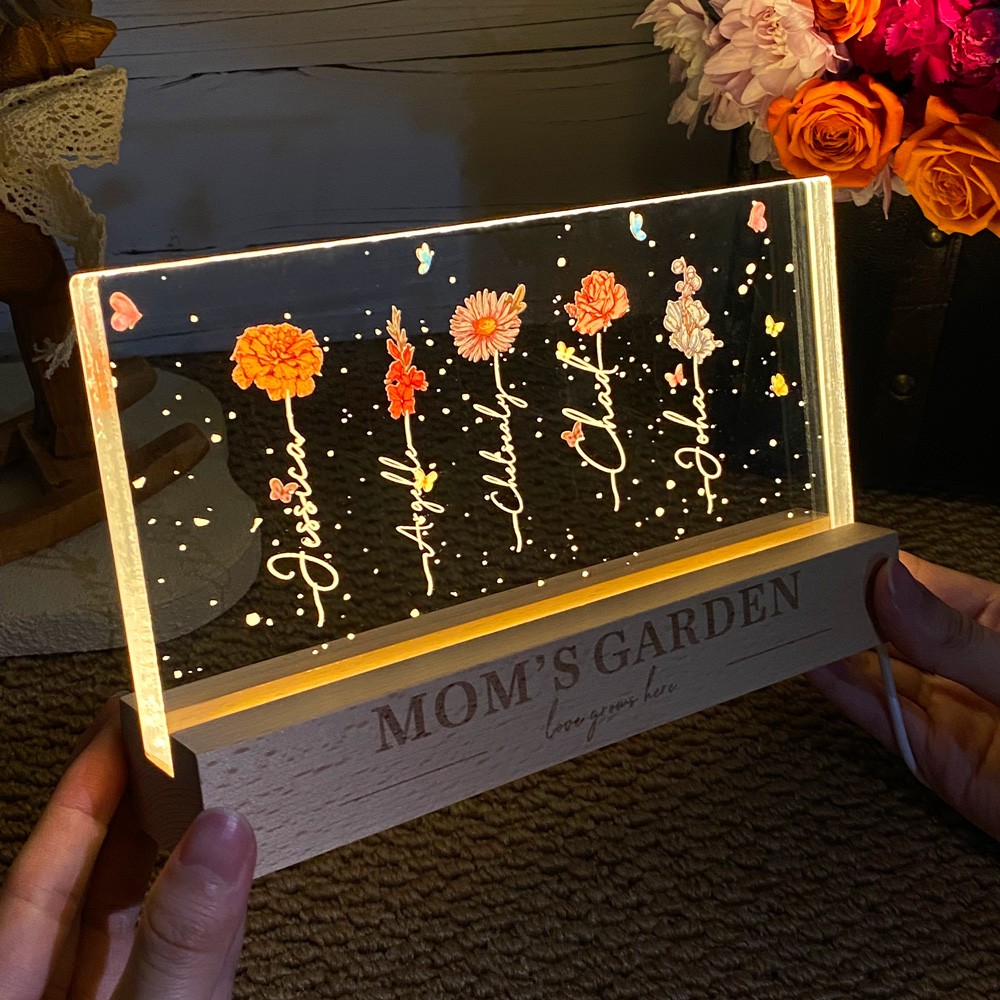 Personalized Mom's Garden Love Grows Here Birth Flower Wood Night Light Unique Gifts for Mom Grandma Mother's Day Gift