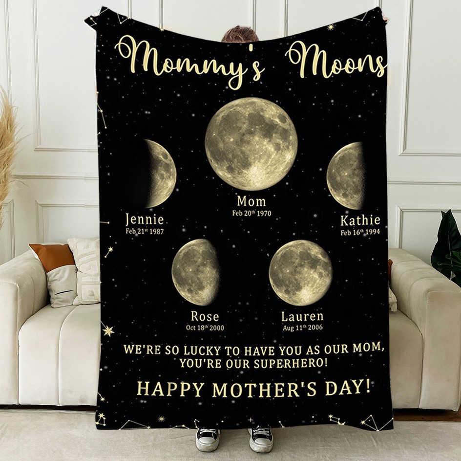 Personalized Mommy's Moon Phase Blanket with Kids Names Unique Gifts for Mom Grandma Mother's Day Gift
