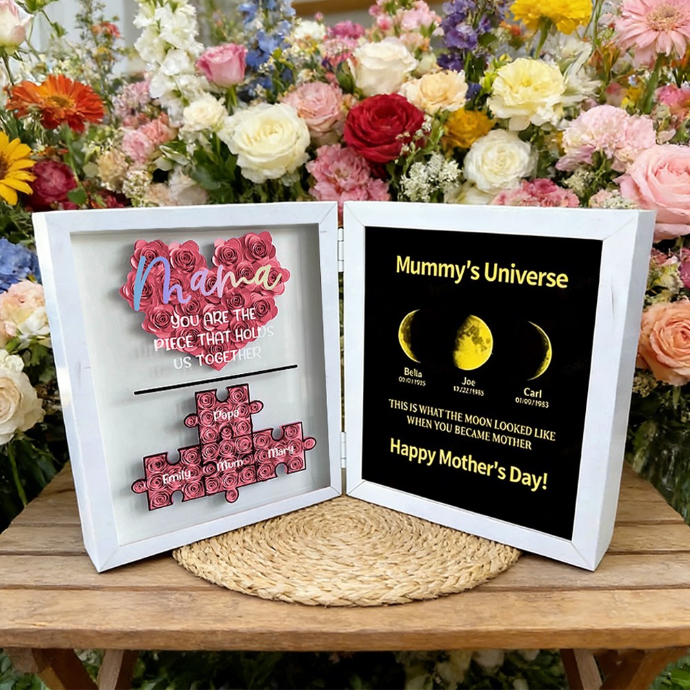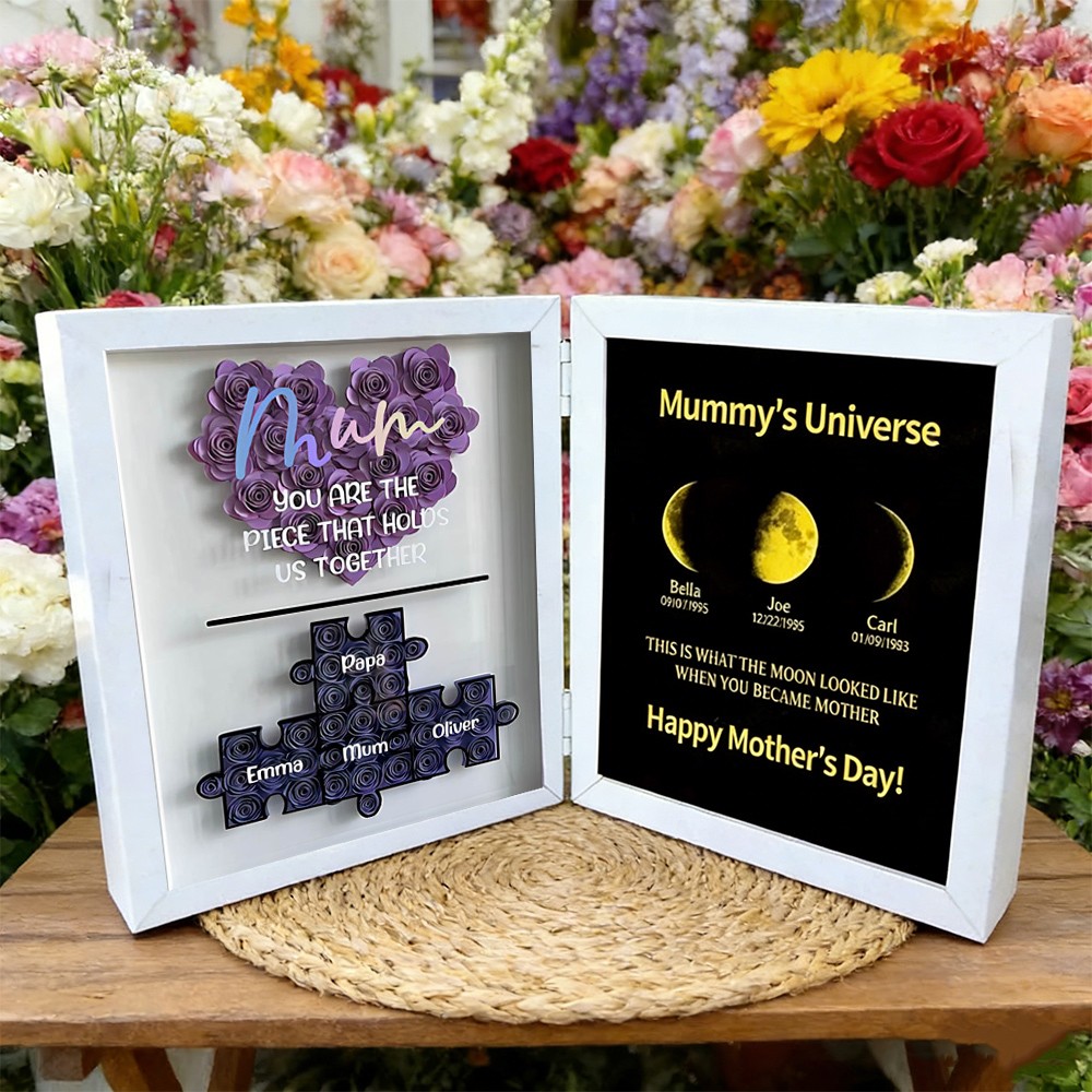 Personalized Puzzle Name Flower Shadow Box with Moon Phase Frame Gifts for Mom Grandma Mother's Day Gift