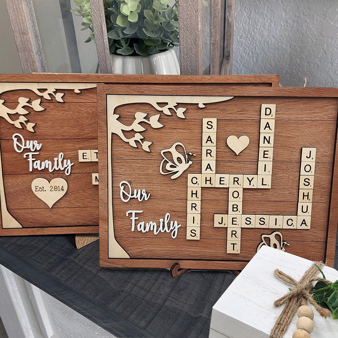 Crossword Scrabble Family Wood Puzzle Plaque Sign with Kids Names Personalised for Mum Family Keepsake Gifts Mother's Day Gift