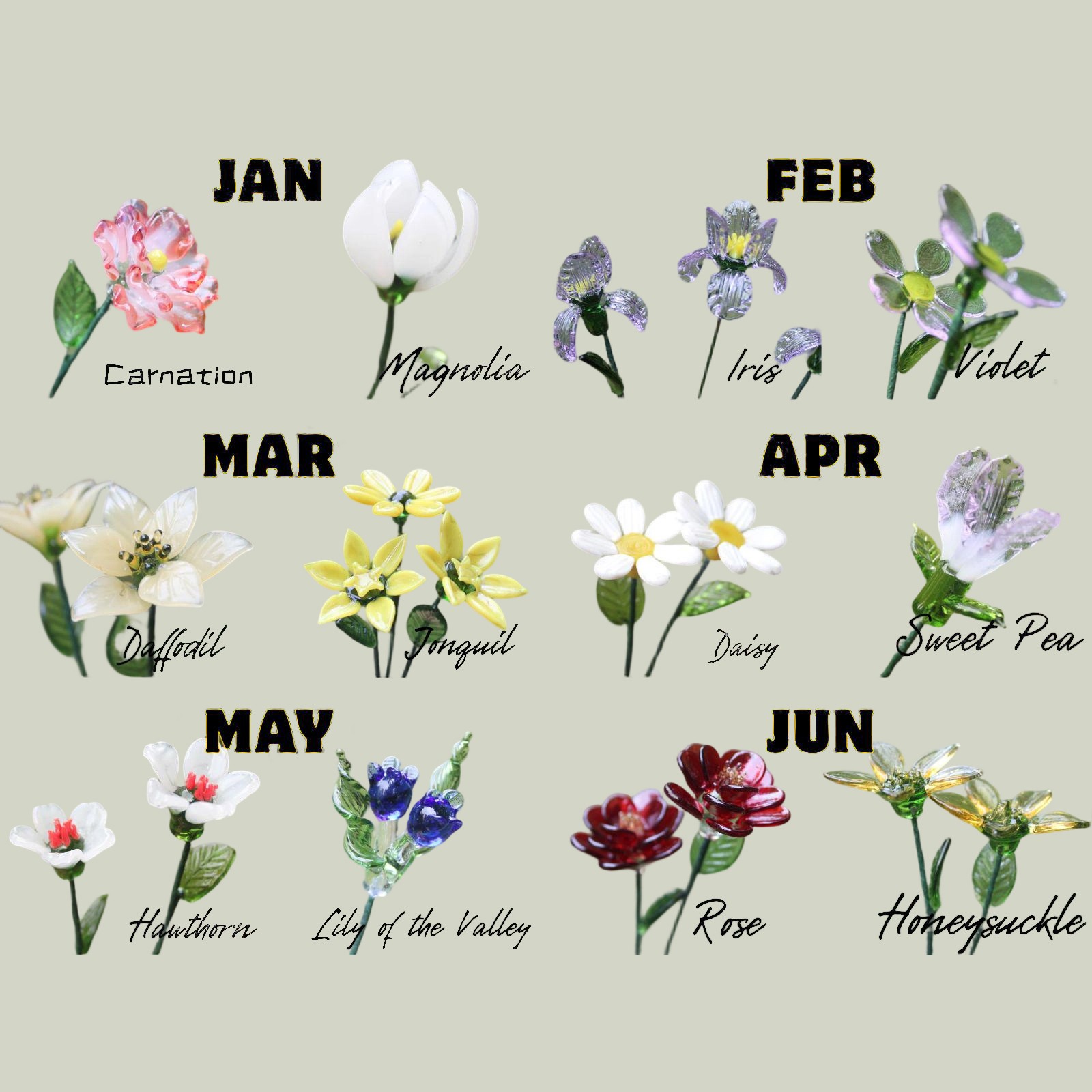 -- Select 12th Flower Type -- January-Carnation January-Magnolia February-Iris February-Violet March-Daffodil March-Jonquil April-Daisy April-Sweet Pea May-Hawthorn May-Lily of the Valley June-Rose June-Honeysuckle July-Larkspur July-Water Lily August-Poppy August-Gladiolus September-Morning Glory September-Aster October-Marigold October-Cosmos November-Chrysanthemum November-Peony December-Narcissus December-Holly