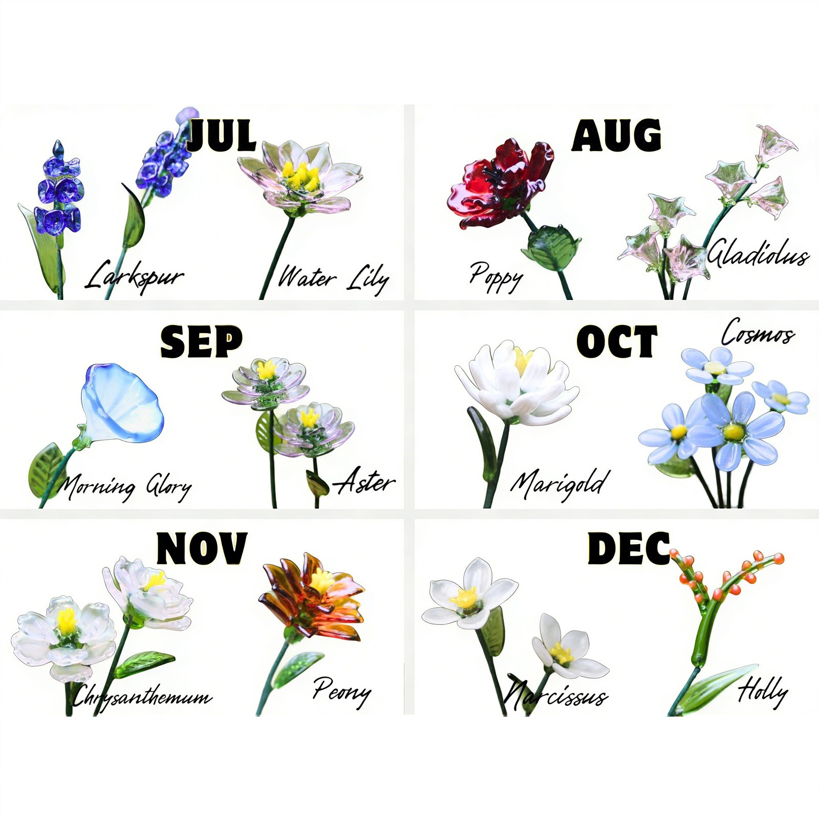 -- Select 8th Flower Type -- January-Carnation January-Magnolia February-Iris February-Violet March-Daffodil March-Jonquil April-Daisy April-Sweet Pea May-Hawthorn May-Lily of the Valley June-Rose June-Honeysuckle July-Larkspur July-Water Lily August-Poppy August-Gladiolus September-Morning Glory September-Aster October-Marigold October-Cosmos November-Chrysanthemum November-Peony December-Narcissus December-Holly