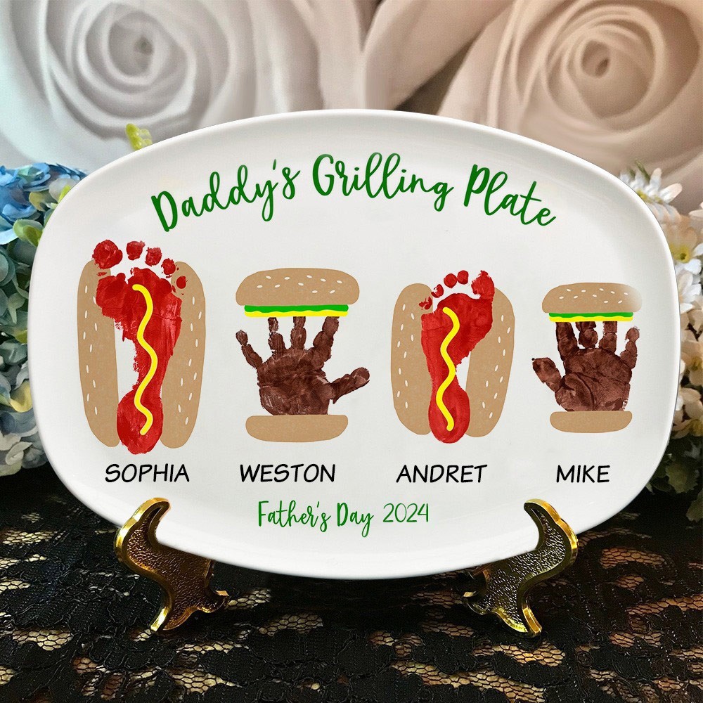 Custom Burger Hot Dog Handprint Footprint Plate with Kids Name Father's Day