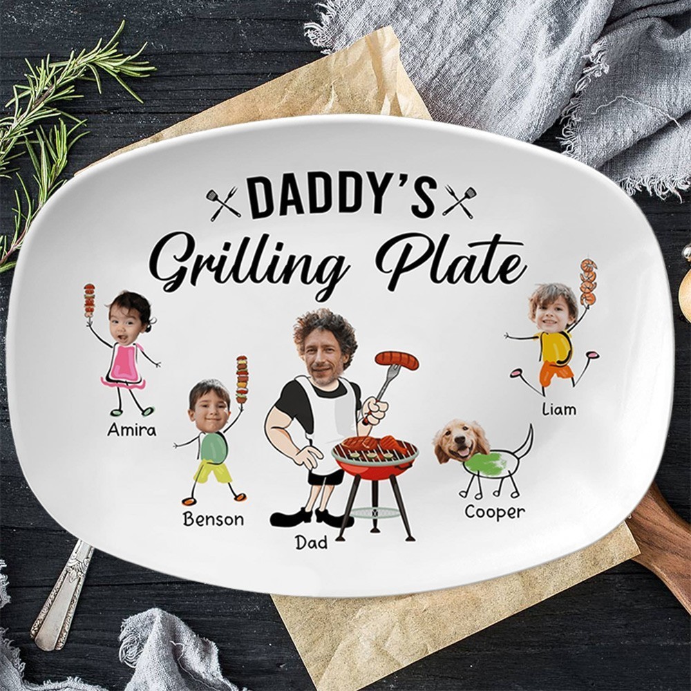 Custom Daddy's Grilling BBQ Plate with Photos and Kids Names Funny Gifts for Dad Grandpa Father's Day Gift