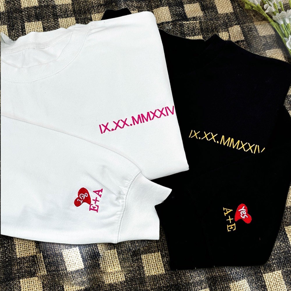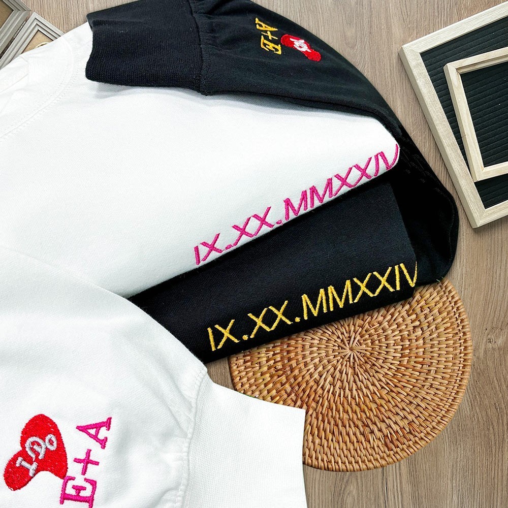 Custom Embroidered Roman Numeral Couple Matching Sweatshirt with Heart Initials on Sleeve 1st Anniversary Gifts for Her Him