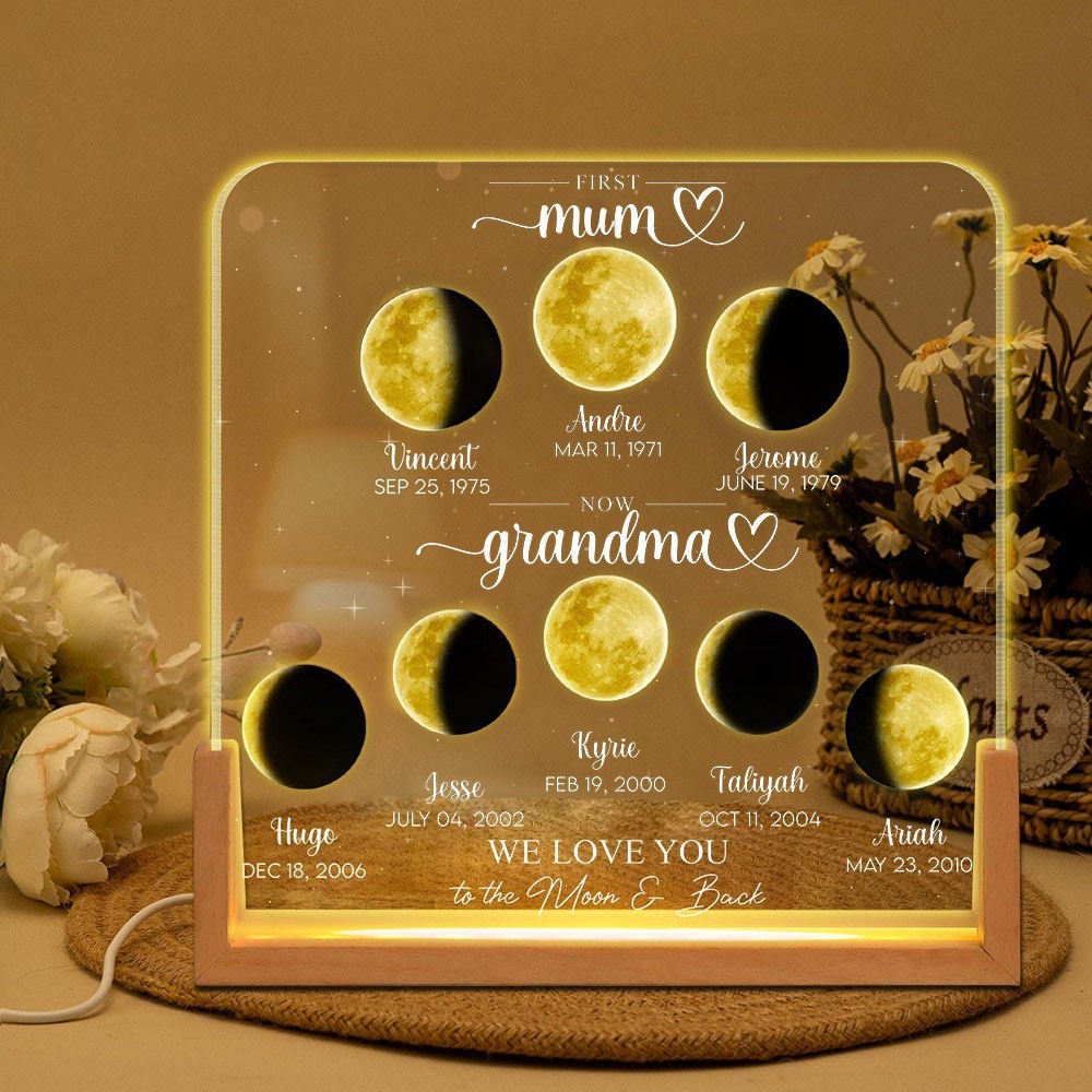 Custom First Mum Now Grandma Moon Phase Night Light By Date with Kids Names for Mother's Day Gift Unique Gift for Mum Grandma