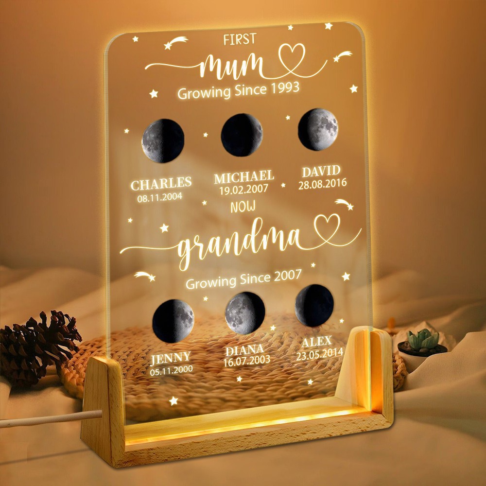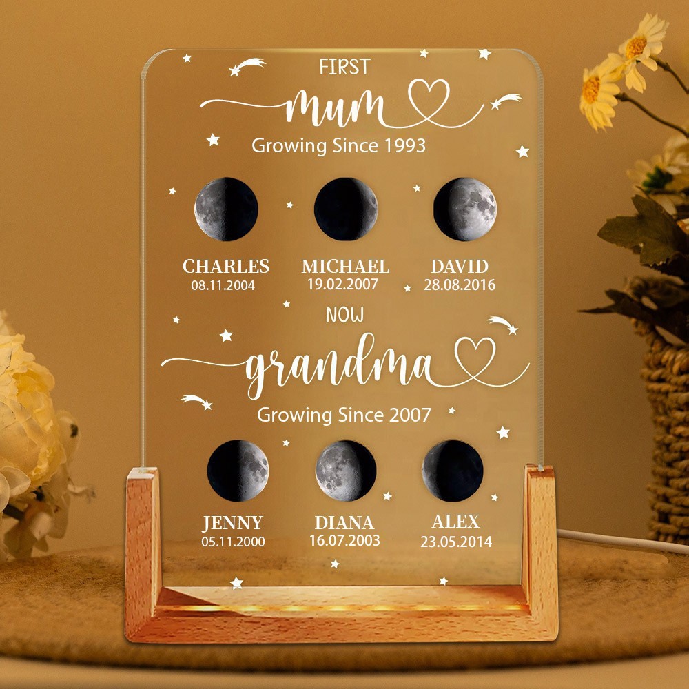 Custom First Mum Now Grandma Moon Phase Night Light By Date with Kids Names Gift for Mum Grandma Mother's Day Gift Ideas