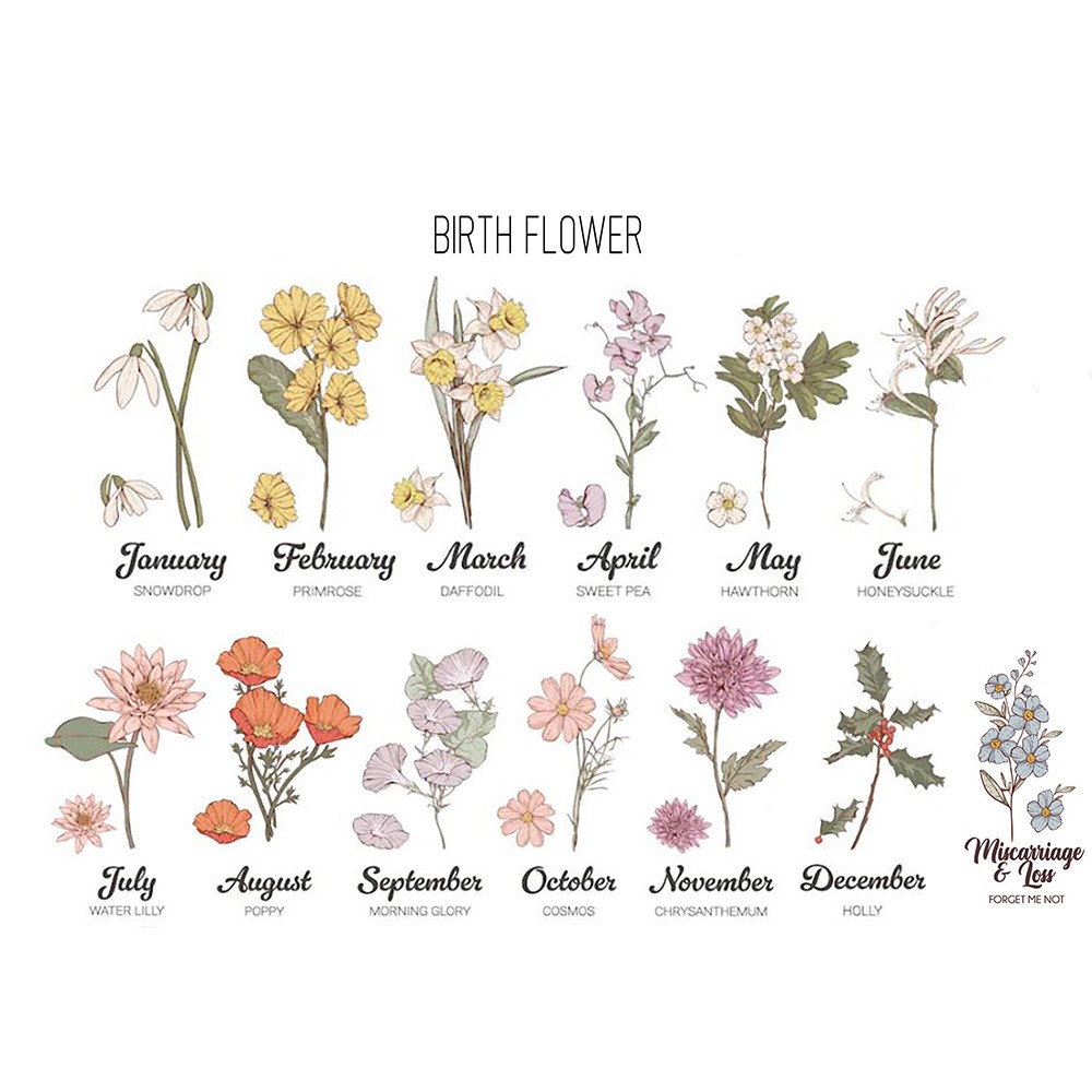 -- Select 10th Flower Type -- January-Snowdrop February-Primrose March-Daffodil April-Sweet Pea May-Hawthorn June-Honeysuckle July-Water Lily August-Poppy September-Morning Glory October-Cosmos November-Chrysanthemum December-Holly Miscarriage & Loss