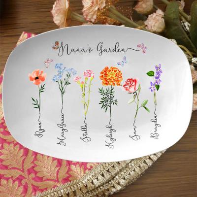 Custom Grandma's Garden Birth Flower Platter With Grandkids Names Unique Gift for Grandma Mum