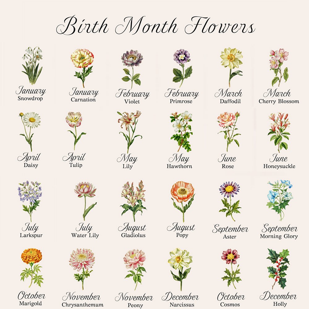 -- Select 11th Flower Type -- January-Carnation January-Snowdrop February-Primrose February-Violet March-Cherry Blossom March-Daffodil April-Daisy April-Tulip May-Hawthorn May-Lily June-Honeysuckle June-Rose July-Larkspur July-Water Lily August-Gladiolus August-Poppy September-Aster September-Morning Glory October-Cosmos October-Marigold November-Chrysanthemum November-Peony December-Holly December-Narcissus