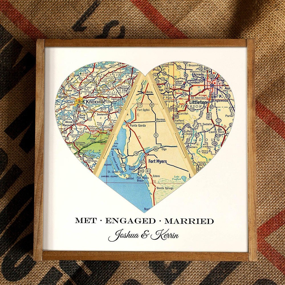 Custom Heart Shaped Met Engaged Married Map Print Frame Unique Wedding Anniversary Gift for Her Him Valentines Day Gifts