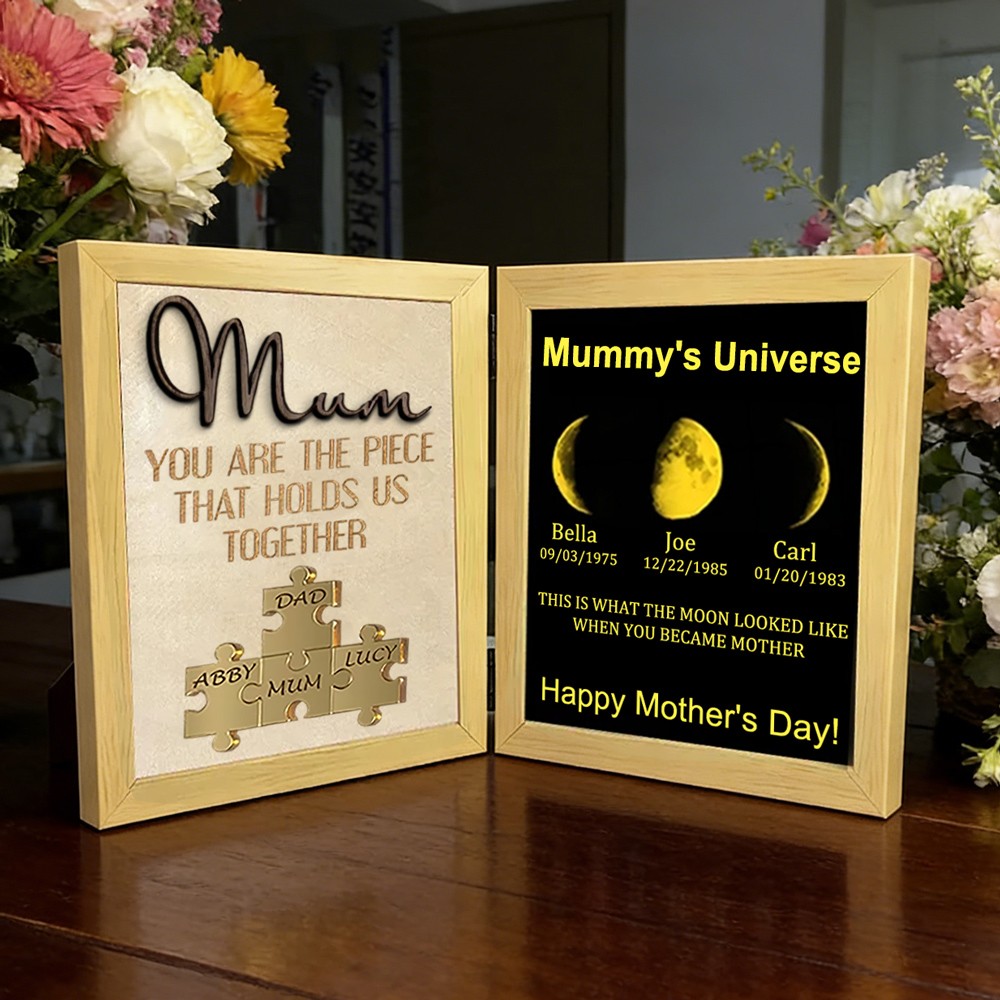 Custom Name Puzzle Piece Sign with Moon Phase Frame – Personalised Family Keepsake Gift for Mum or Grandma, Perfect for Mother's Day
