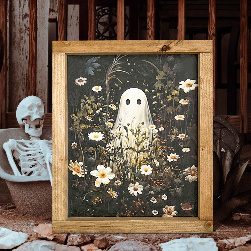 Halloween Ghost In Flower Field Print Wood Sign Unique Halloween Gifts