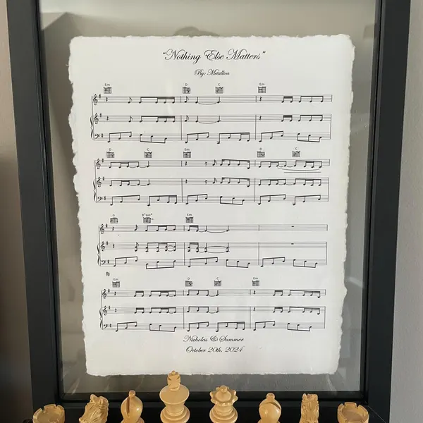 The leather is a representation of growth and resilience and the unique journey of every couple. This sheet music art is a heartfelt testament to the enduring love that binds you and your partner. It's a tangible symbol of the bond you share and a reminder of the years you've journeyed together.