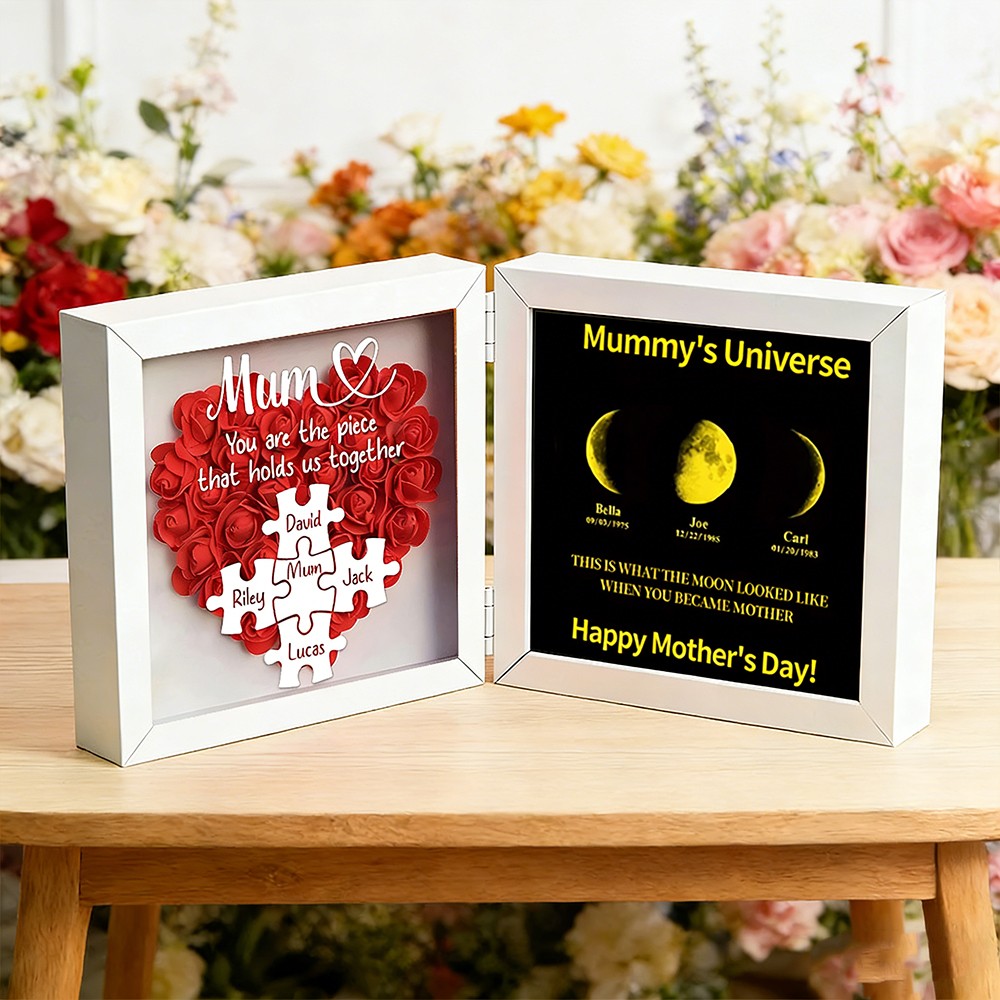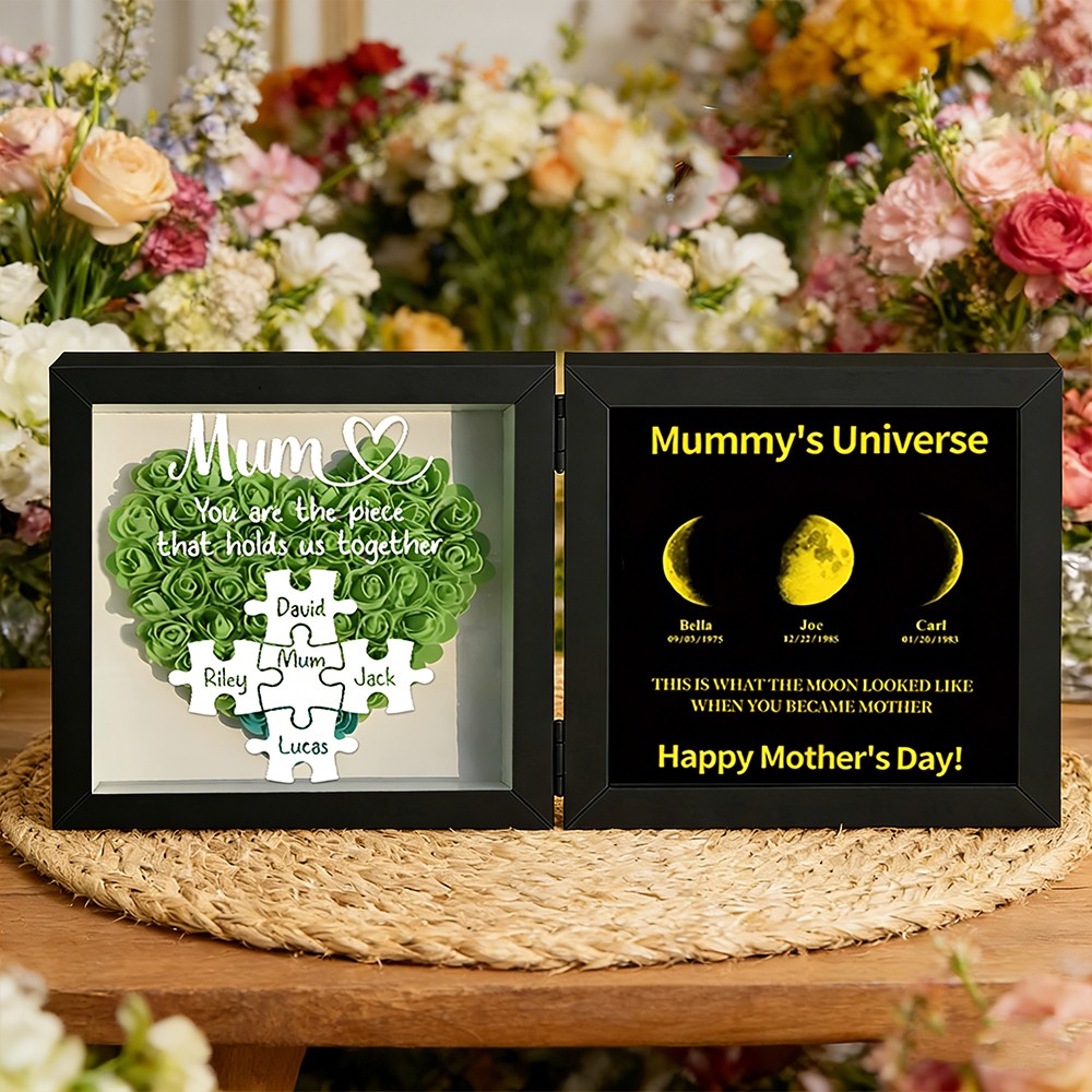Mum You Are The Piece That Holds Us Together Custom Puzzle Name Flower Shadow Box with Moon Phase Frame for Mum Mother's Day Gifts