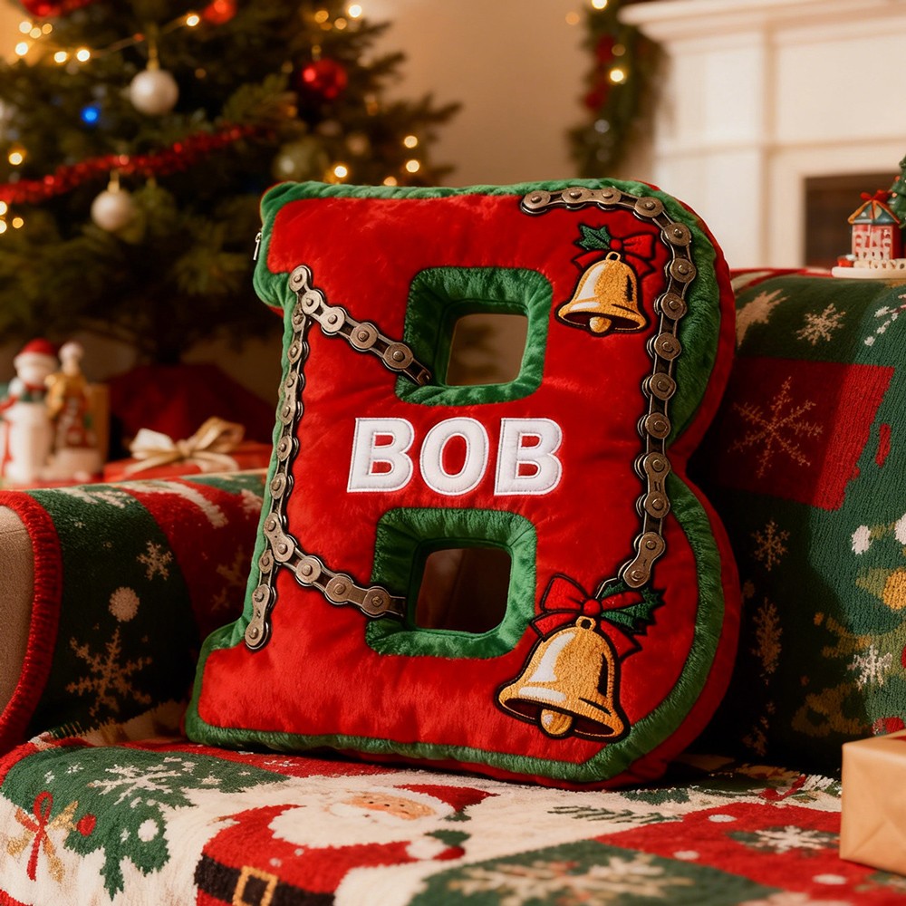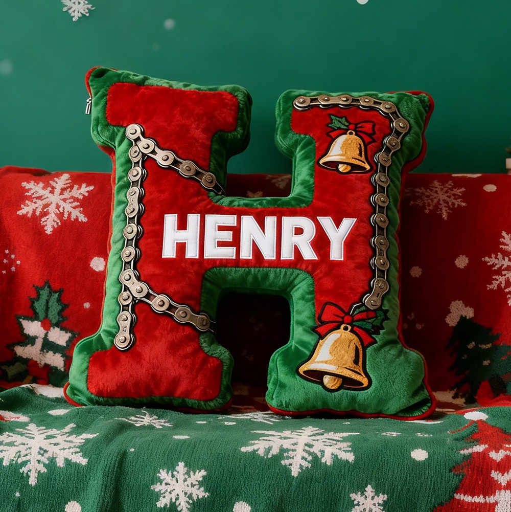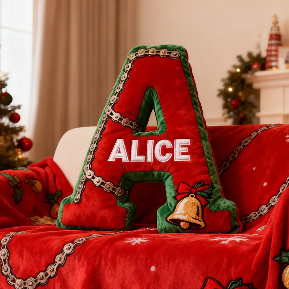 Celebrate the holidays with this festive and personalised letter pillow! Featuring vibrant red and green colors, a chain-like design detail, and a cheerful embroidered bell, this plush pillow brings a unique holiday charm to your decor.