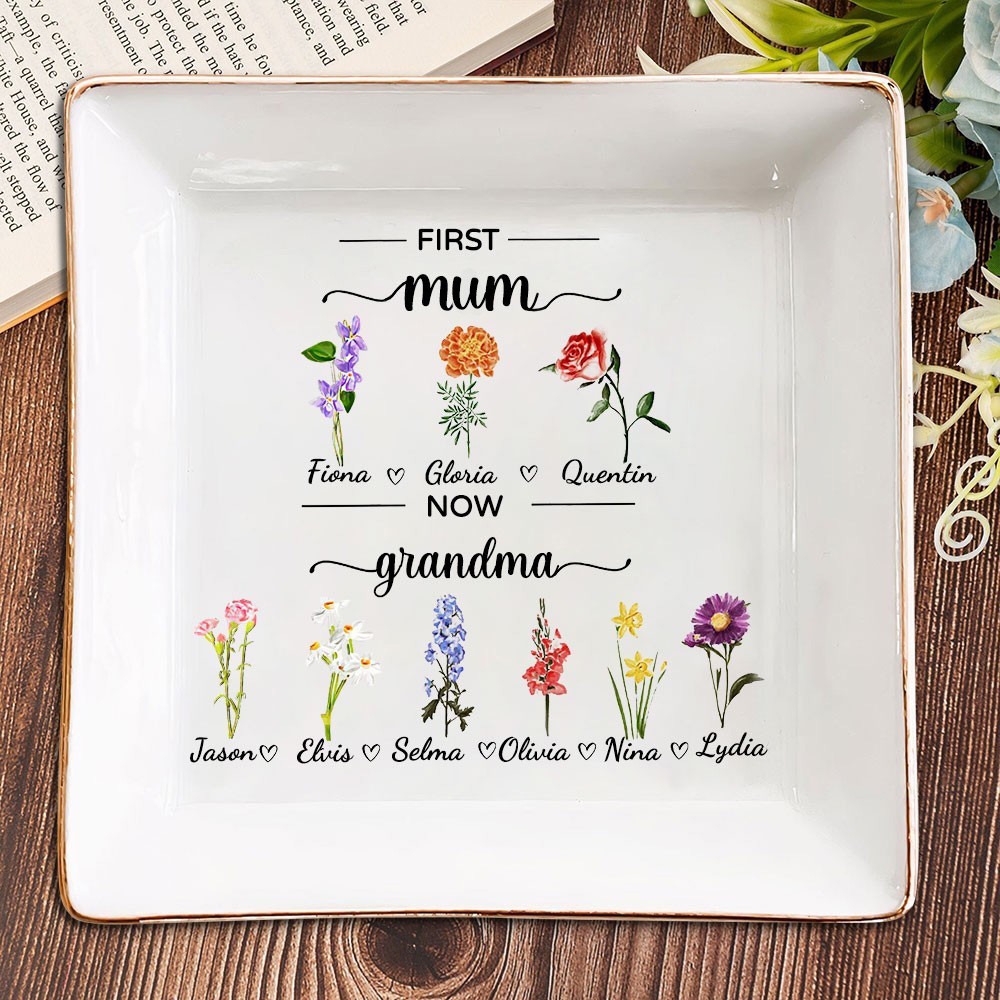 Personalised First Mum Now Grandma Birth Flower Jewellery Dish with Kids Names Gift for Mum Grandma Christmas Gift